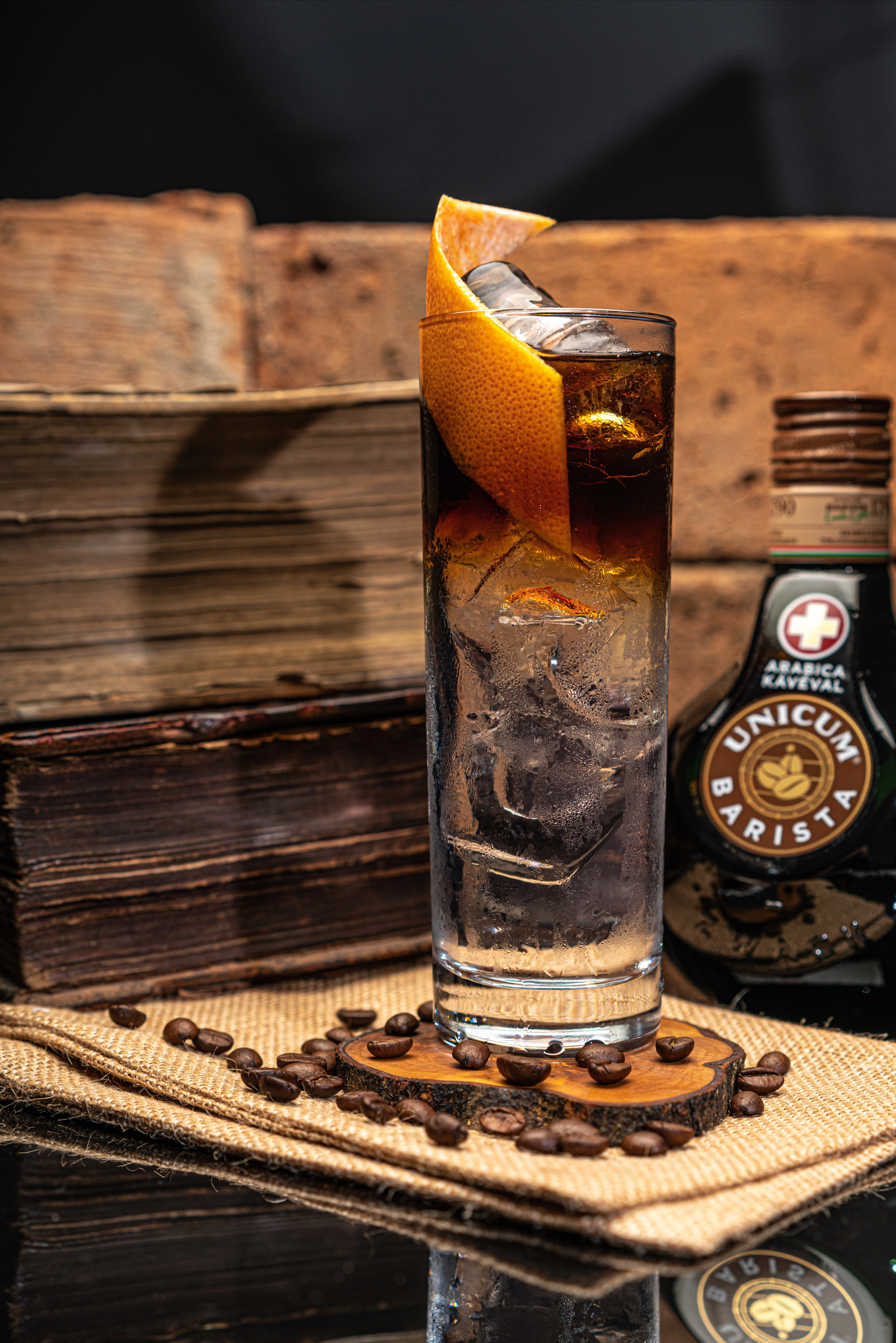 Hozzávalók: 40 ml Unicum Barista, 10 ml cukor, jég, a díszítéshez: narancs peel
