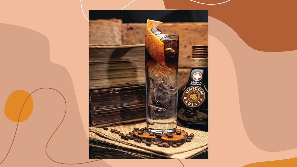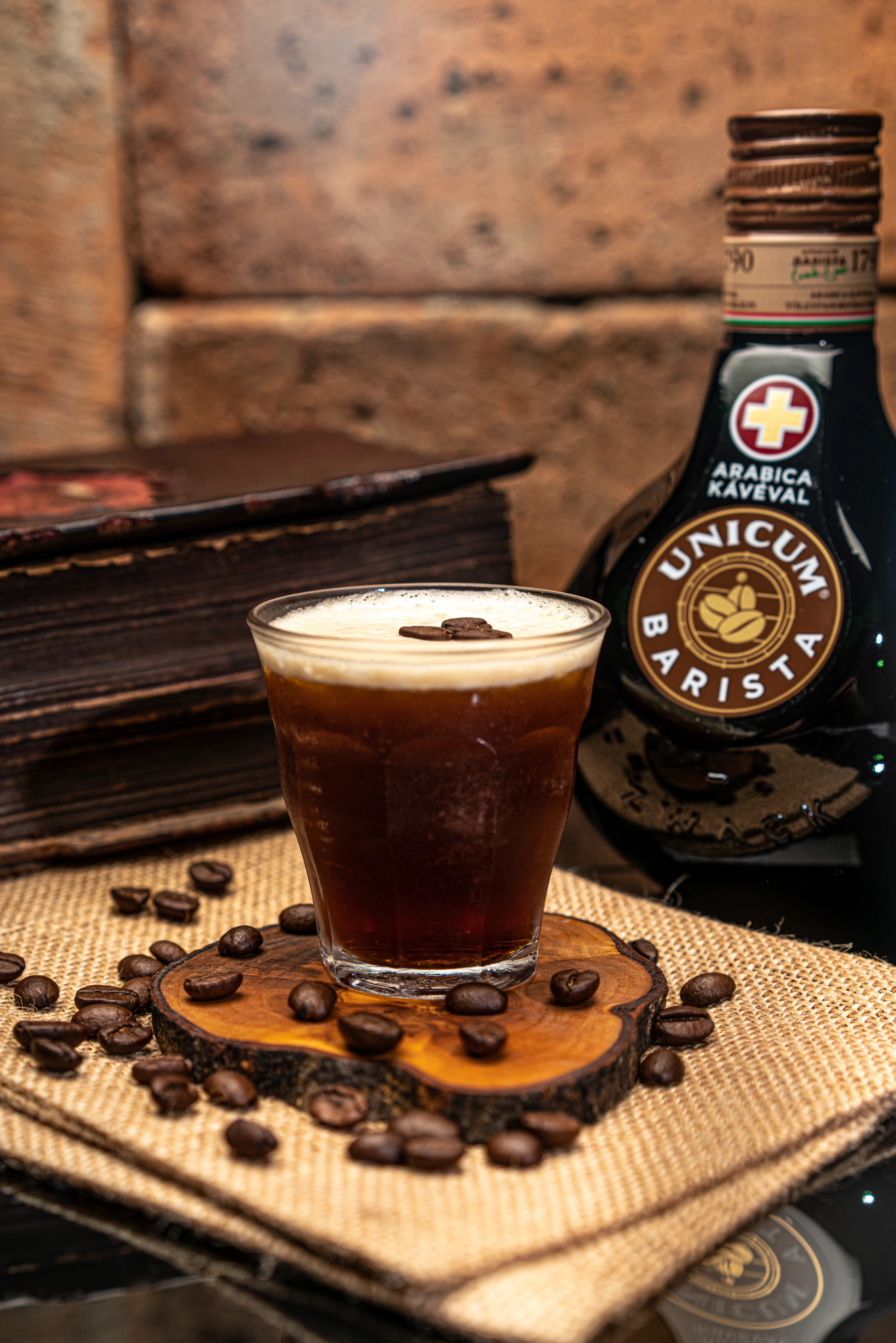 Hozzávalók: 40 ml Unicum Barista, 50 ml hideg tejhab, a tetejére: kávészemek
