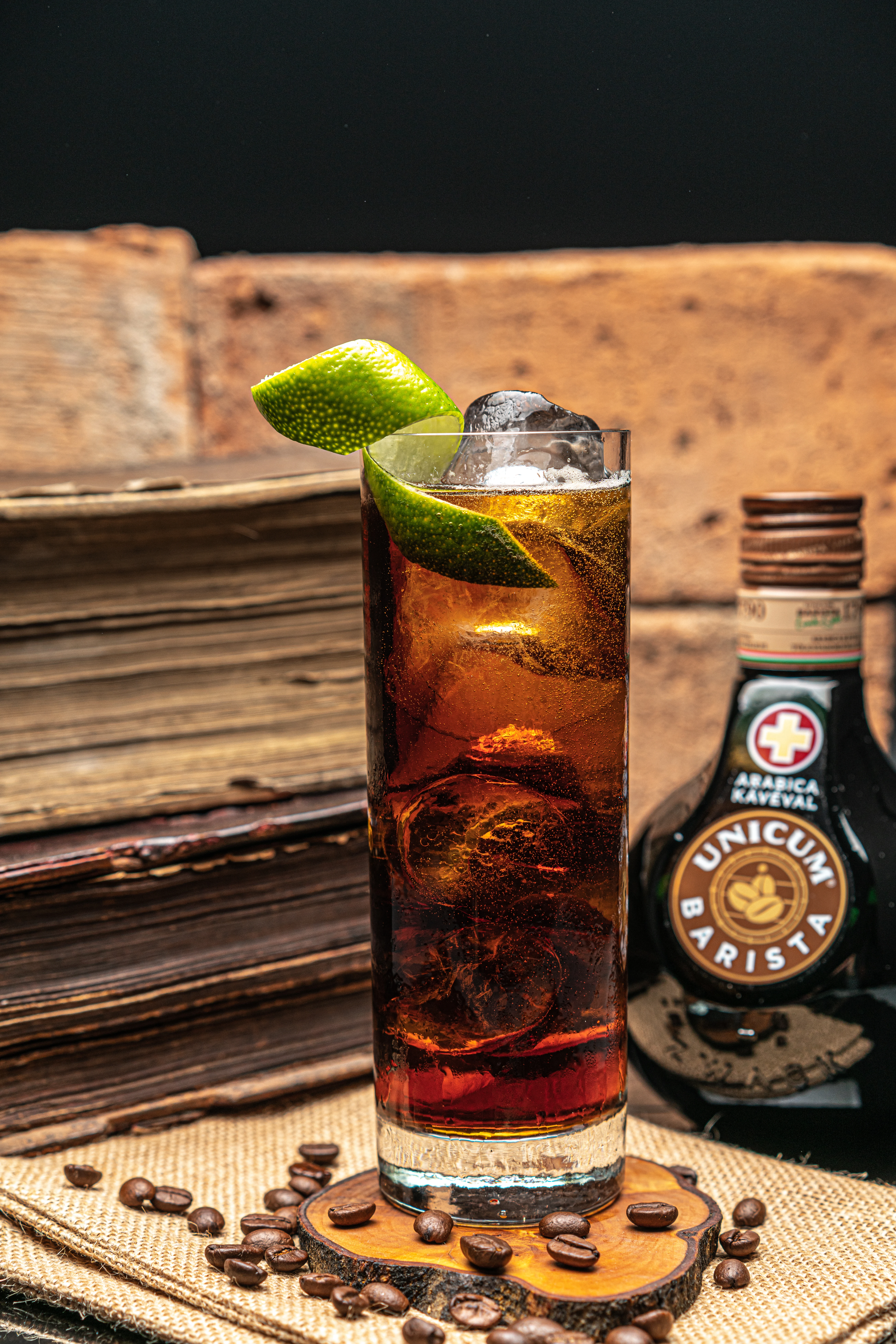 Hozzávalók: 40 ml Unicum Barista , 130 ml Component Cascara Base, jég, a tetejére: lime peel