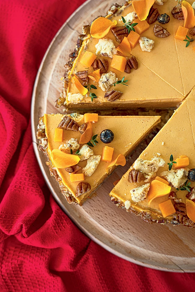 az édesburgonyás süthető krém maradék hozzávalóival. Ezután öntsd a pekános tésztára, és süsd 150 fokon 45 percet. Harmadik fázisként készítsd el a torta tetejére kerülő krémet. Melegítsd fel a hozzávalókat egy edényben, add hozzá az előtte vízbe áztatott zselatint. Öntsd a torta tetejére, majd tedd minimum öt órára a hűtőbe. Díszítheted pekándióval, a maradék morzsával és narancslében párolt édesburgonya-kockákkal is.