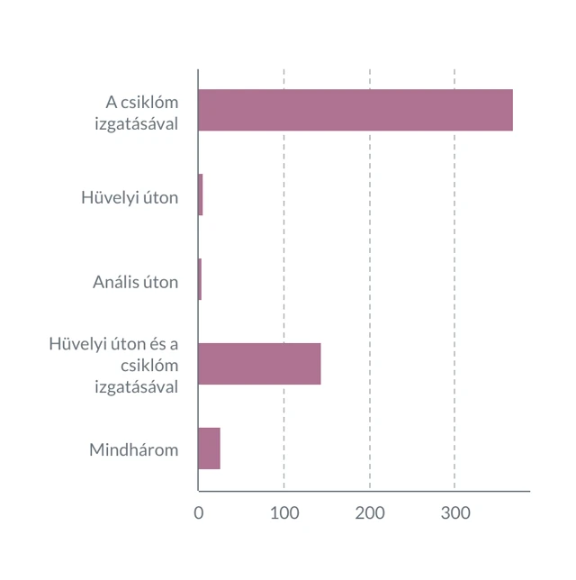 A kitöltők 60 százaléka a csiklója izgatásával juttatja el magát a csúcsra, míg 34 százalék (a csikló izgatása mellett) hüvelyi úton is kényezteti magát. 4 ember anális úton éri el az orgazmust, a kitöltők 4,5 százaléka mindhárom módon maszturbál; 9 százalékuk pedig a "változó" választ jelölte meg. Ennél a kérdésnél nem volt releváns összefüggés a kor és a maszturbáció típusa között, mivel a legtöbben a csikló izgatásával juttatják el magukat a csúcsra.