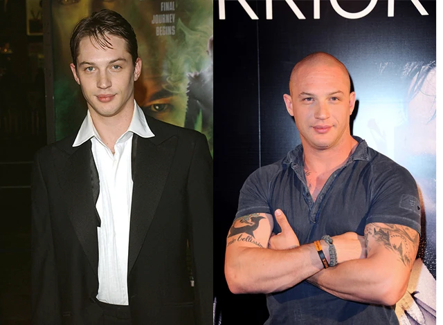 Tom Hardy 2003-ban még egészen vékony volt és hosszabb hajat hordott, majd 2011-ben nagyon formába hozta magát és a haját is teljesen leborotválta a Warrior filmes szerepéért.