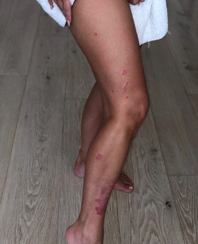 A pikkelysömör tünetei Kim Kardashian lábán: