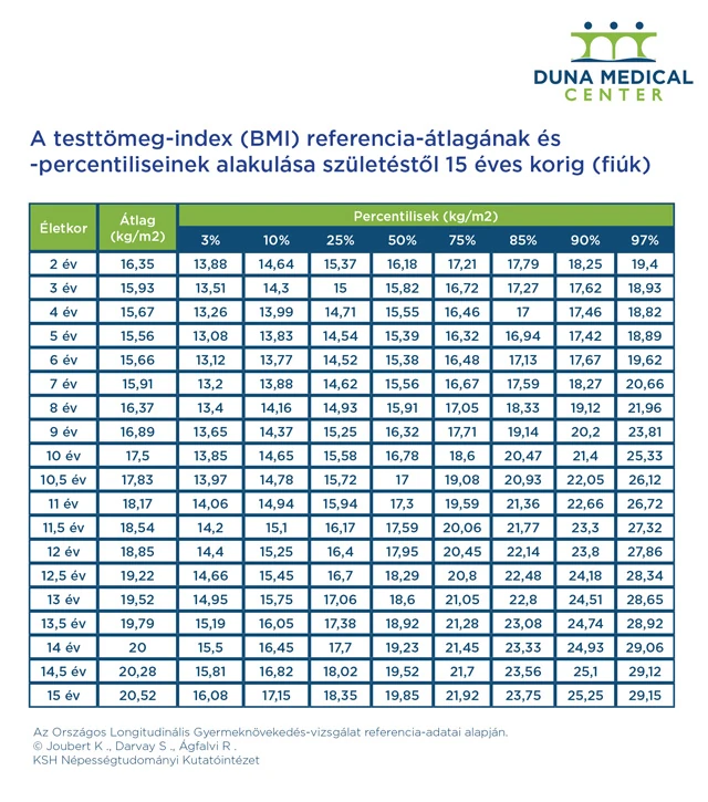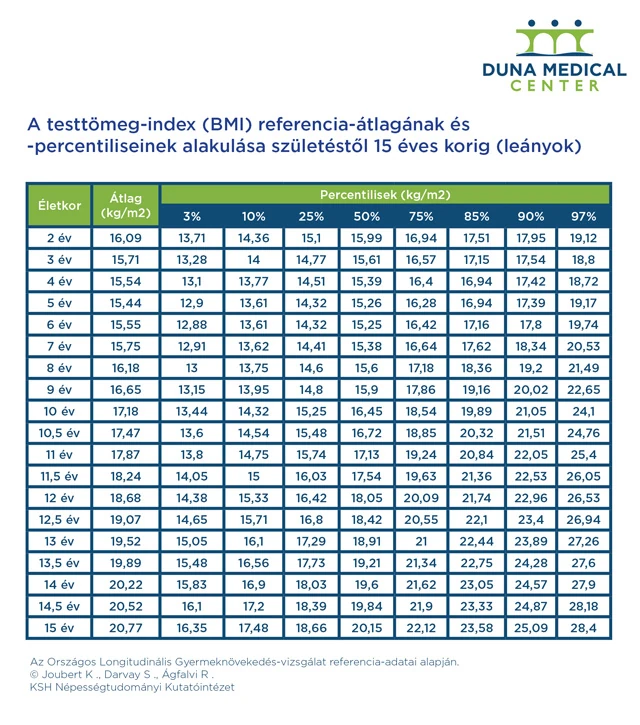 Amíg egy baba anyatejet, vagy annak pótlására tápszereket kap, nem beszélhetünk elhízásról, ha mégis súlytöbblet jelentkezik, annak valamilyen genetikai betegség áll a hátterében – hangsúlyozza Somogyi Krisztina, a Duna Medical Center dietetikusa. Az elhízás akkor alakulhat ki, amikor az anyatej és a tápszerek helyett a gyermek áttér a felnőttek által fogyasztott ételekre. Ez jellemzően az egy és két éves kor közötti időszakra tehető, de a második életévet követően szinte minden gyermek a család által fogyasztott ételeket eszi. Születéstől kezdve a BMI érték alakulását táblázatok alapján követhetjük, hogy az adott kor és nem szerint milyen referencia értéknek kell a gyermek hossz- és súlynövekedésének megfelelnie. Az ettől való eltérés százalékban fejezhető ki, ami alapján megállapítható, hogy akár súlyban, akár magasságban milyen mértékű az eltérés az átlaghoz képest. Érdemes rendszeresen kiszámolni a BMI értéket (lásd táblázatok), mert ha ez az érték 75% fölé emelkedik, a gyermek már a veszélyeztetett kategóriába tartozik. 90% fölötti érték esetében túlsúlyról beszélünk, 97% fölött pedig már az elhízott kategóriába soroljuk be a gyerekeket.
