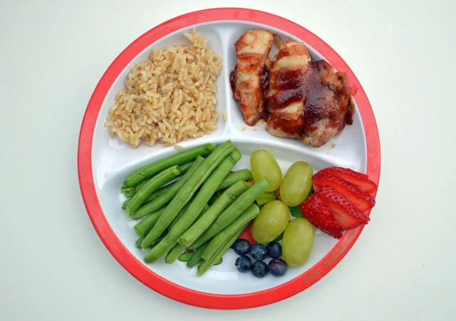 Mint látjátok, a tányér felét zöldségek és gyümölcsök foglalják el, a húsok körülbelül egynegyedet, a köret szintén. Ezt nagyon könnyű észben tartani, és igen jól alkalmazható a mindennapokban, hisz elég csak ránézni a tányérunkra. Persze gyümölcs helyett lehet friss saláta is, a lényeg, hogy a főtt zöldség mellett mindig legyen friss zöldség vagy gyümölcs is a tányéron. Merengjetek el a képen egy kerek percig, és meglátjátok, ennyi pontosan elég is lesz, hogy ne felejtsétek el.
