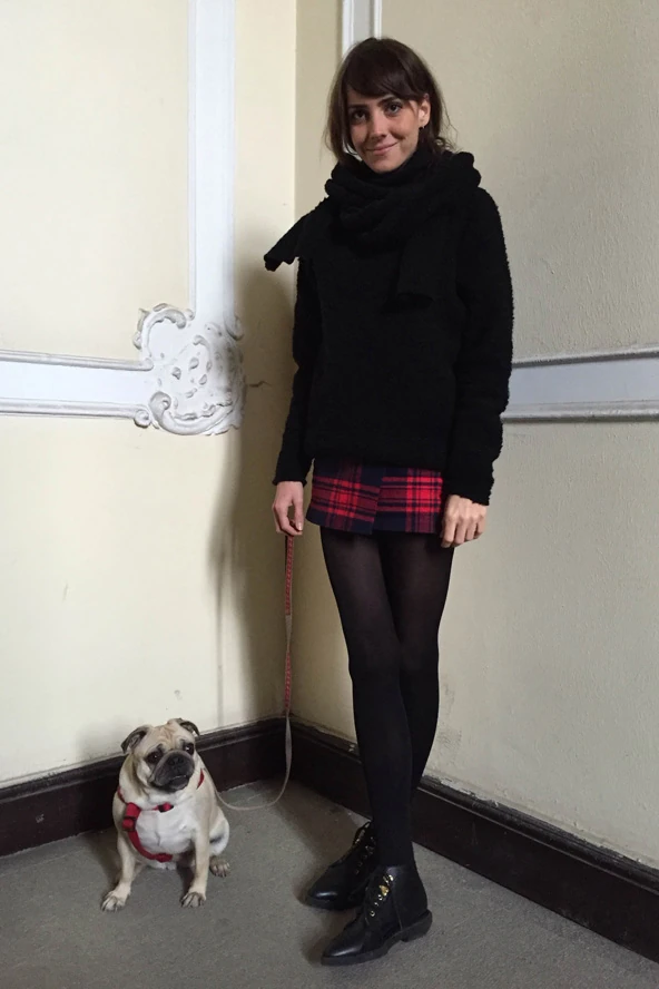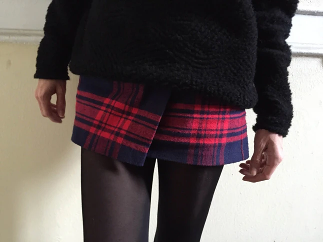 A változatosság kedvéért ma reggel is fáztam, ezért egy nagyon meleg gyapjúpulóvert húztam magamra a miniszoknyához. Ritkán hordok szoknyát, és ez az első mini, amit életemben vásároltam. A fiúbarátaim állandóan a kockás flanelingeimmel cukkoltak, hogy mikor dobom már ki őket, úgyhogy ezzel a szoknyával kötöttem kompromisszumot.