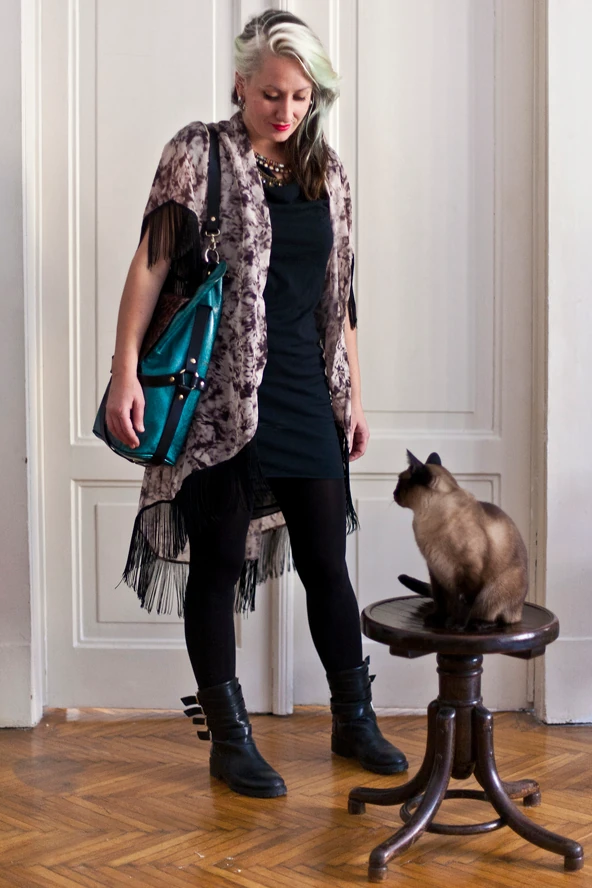 Ma jó sokat fogok gyalogolni ide-oda, úgyhogy kivételesen nem magas sarkúban vagyok, de egyébként a bakancsokat is imádom. Mára egy ilyen jó kényelmes rucit választottam, ezzel a kis köpenykével, amit le se lehetett vakarni rólam a fesztiválszezonban. Aki pedig mellettem figyel az Cicus, akivel elválaszthatatlanok vagyunk!