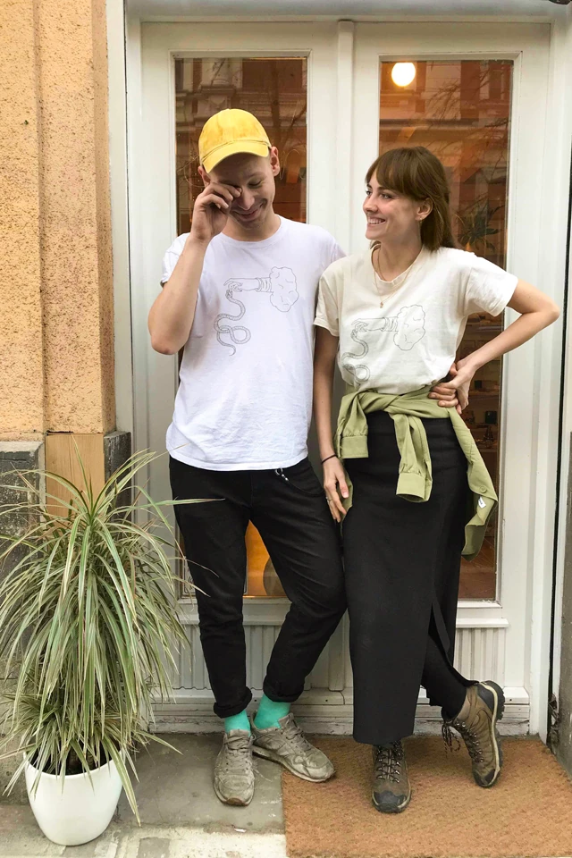 Ma szintén egész nap a műhelyben dolgoztunk. Beugrott meglátogatni engem a nap folyamán a barátom, akivel most nyilván nem véletlenül öltöztünk ugyanolyan pólóba :) Viszont sokszor megesik magunktól is, hogy aznap hasonló színeket párosítunk össze. Ráadásul mindkettőnk aktuális kedvenc színe a napsárga . A DAIGE Snake tee-t viseljük, Máté fehér alapon, az enyém pedig natúron. Rajtam még egy Sportmax vászoning és egy fekete elől sliccelt szoknya van. Mivel ritkán hordok szoknyát, szeretem fiúsabb, erőteljesebb dolgokkal párosítani, mint a túrabakancs.