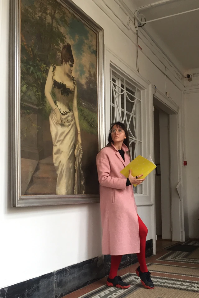 Amellett, hogy a nemrégiben bemutatott Cseresznyéskert című darabnak is otthont ad az Országos Színháztörténeti Múzeum és Intézet, minden alkalommal szeretek itt kutatni, hiszen megtalálható az összes színházi előadás, rengeteg kézirat, szövegkönyvek és maga az épület is csodaszép. Ilyenkor kicsit az egykori nagy művészek között érzem magamat. Nagyon szeretem a színes szövetkabátokat, mivel jó átmenetet képeznek a téli és a tavaszi szezon között. Meleg, intenzív színvilágával mégis feltölt és feldobja a teljes szettet.