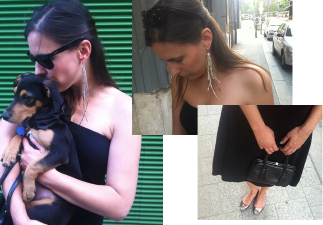 Ma rohangászós napom van. Nap közben irodán kívüli tárgyalások, délután wonderLABbel kapcsolatos intéznivalók várnak. Ráadásul kölcsön kaptam kis húgom kutyáját is…persze csak egy séta erejéig. Ilyen napokon egy kényelmes fekete pamutruha a legpraktikusabb viselet számomra, amit azért feldobok az aktuális kedvenc fél pár fülbevalómmal. Szerencsére minden megy hozzá. A mai favoritom, eVe nekem készített extra hosszú ezüst fűszál fülije.