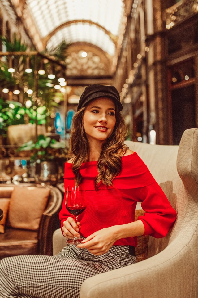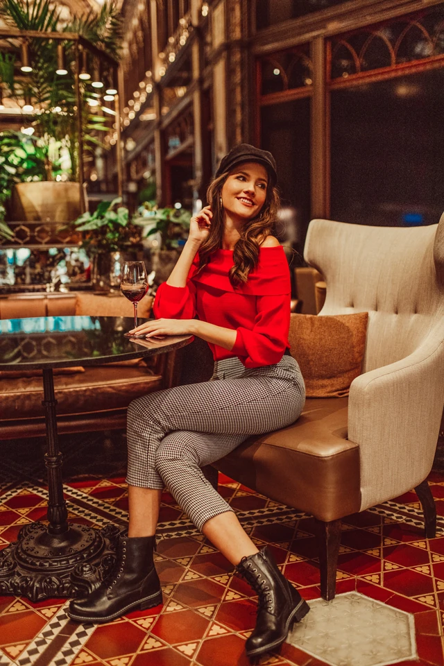 Ma ünnepeltük a baratnőm születésnapját, amihez ezt a piros pulcsis szettet választottam, amit a mostanában újra divatba jött izgalmas fekete-fehér szövet nadrággal vettem fel. Szeretem az elegáns stílust a vagánnyal kombinálni, ezért egy fekete bőr bakanccsal turbóztam fel az outfitet. Kiegészítőnek pedig egy fekete tengerészsapkát és egy arany fülbevalót viseltem.