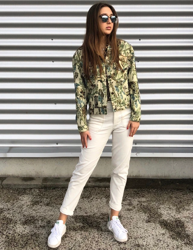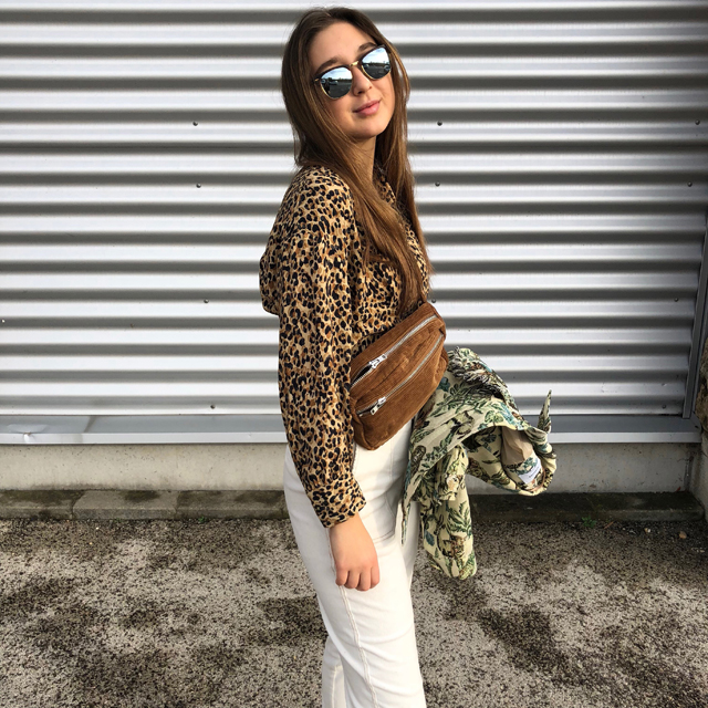 Nagyon fontosnak tartom, hogy a sok fast fashion márka helyett vagy legalább mellett, viseljük a magyar tervezők darabjait is. Tudom, hogy drágának tűnnek ezek a termékek, hiszen nem készül belőlük több millió darab, de sokszor számomra fontosabb ha van inkább egy értékes darabom, ami magyar tervezőtől munkája, mint öt olcsóbb nemzetközi fast fashion termék. Ezt a Nanushka dzsekit a leértékelésben vásároltam, s igaz a nyári kollekcióból való, de elég vastag anyagból készült és különben is annyira meleg van, hogy simán egy őszi összeállítás része lehet. Imádom a mintákat egymással párosítani, ezért egy párducmintás blúzt vettem a Nanushka dzseki alá. Az idei őszi-téli divat nagy slágere, a kordbársony két helyen is feltűnik az öltözékemben, a fehér nadrág és a camel színű övtáska is ebből készült. A platformos Stan Smith-emet szinte mindenhez képes vagyok felvenni!