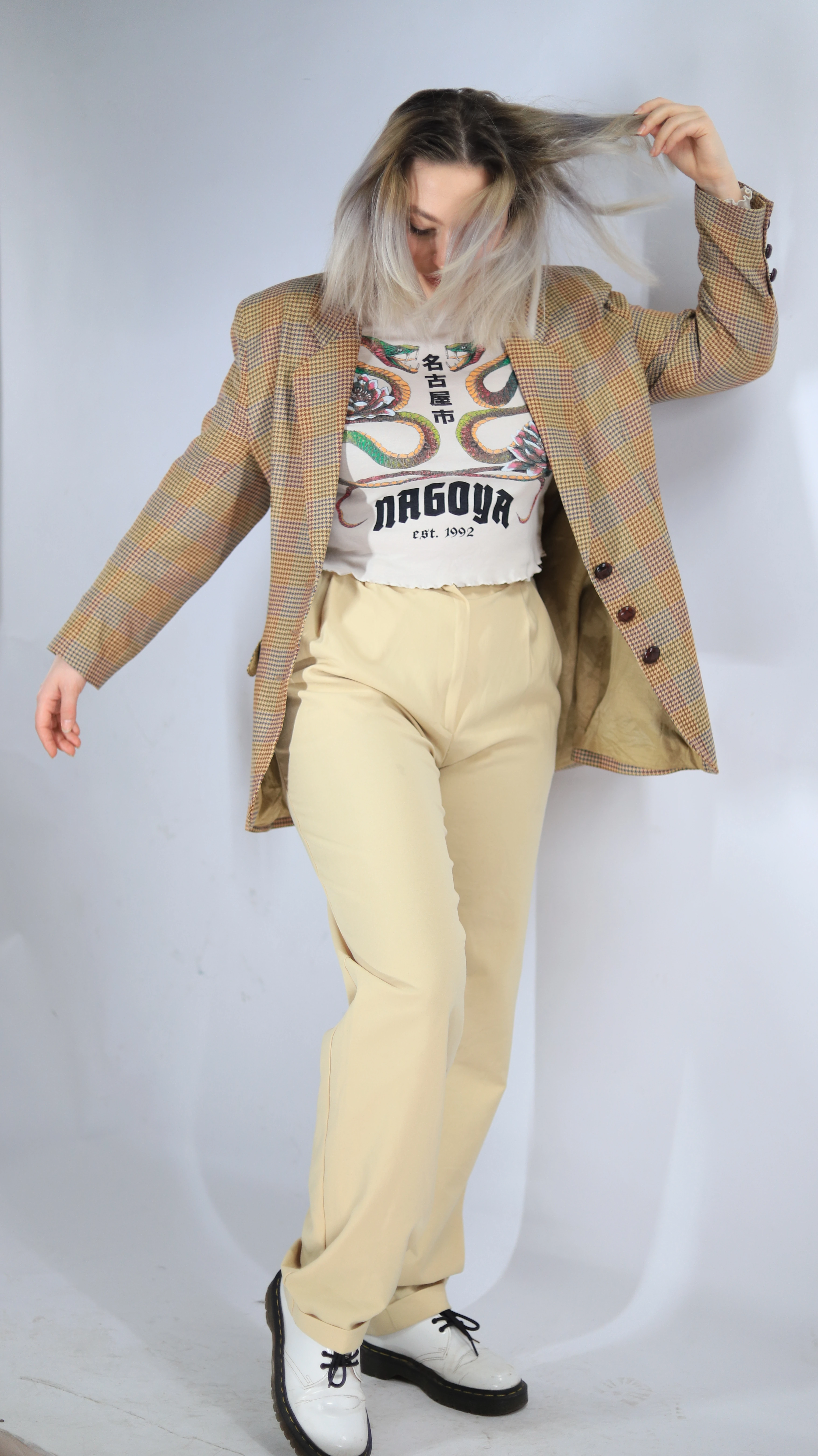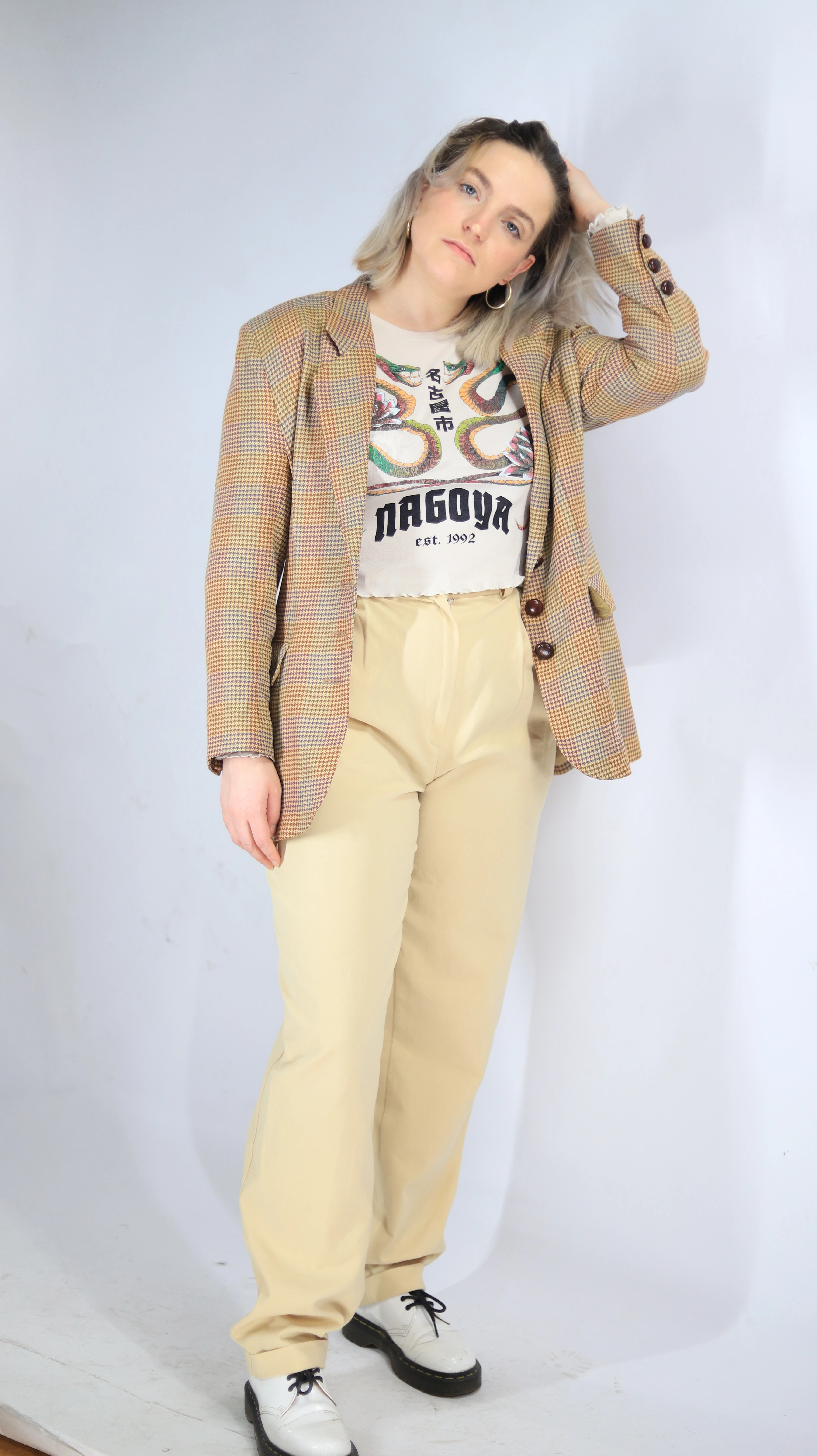 „Imádom a nagypapa szabású ruhákat, mint ez a zakó vagy nadrág. Elegánsak, de otthonosak, egyszerűen mindent feldobnak.”
