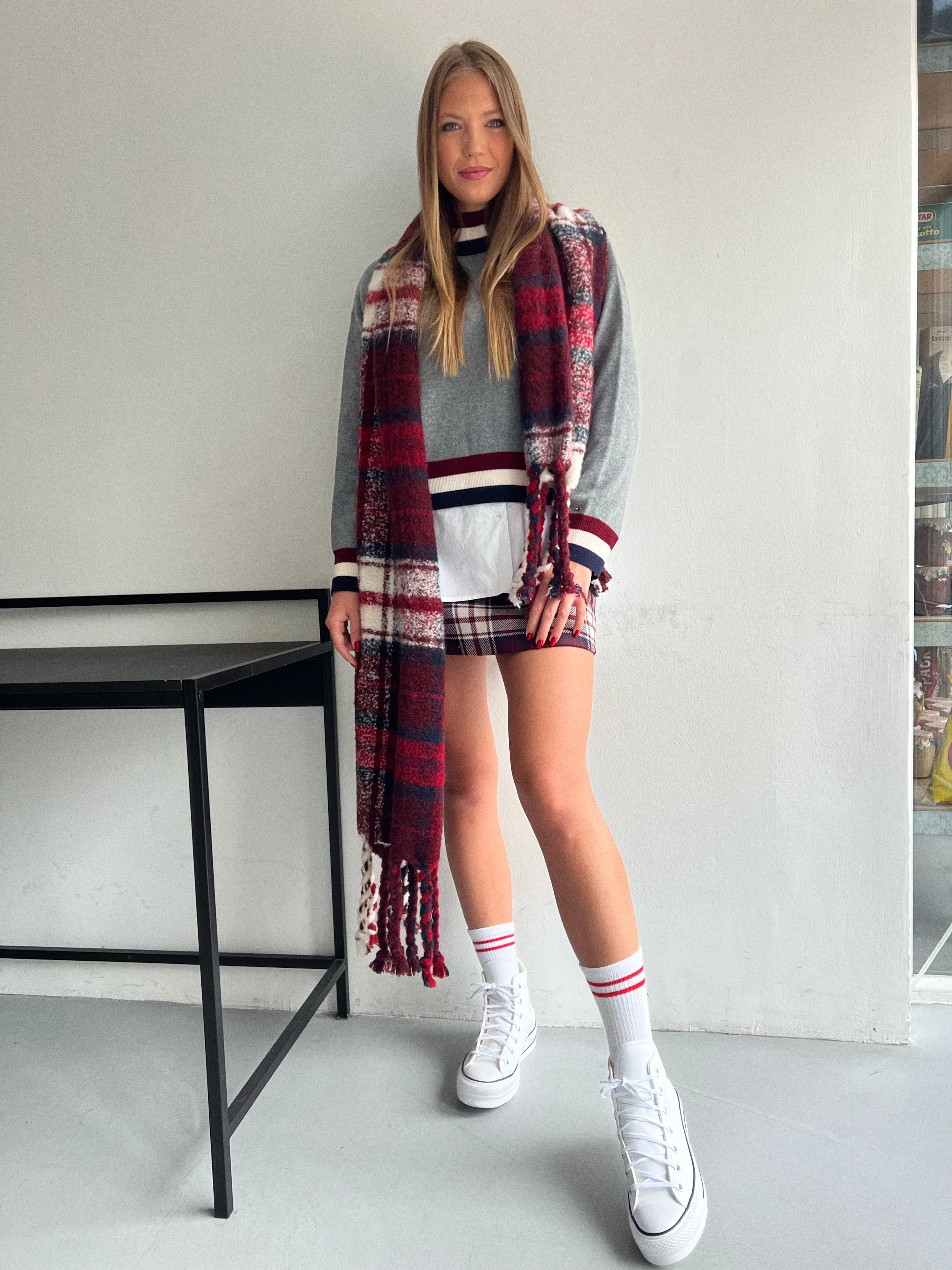 Szoknya, ing, pulóver, sál, cipő: Tommy Hilfiger