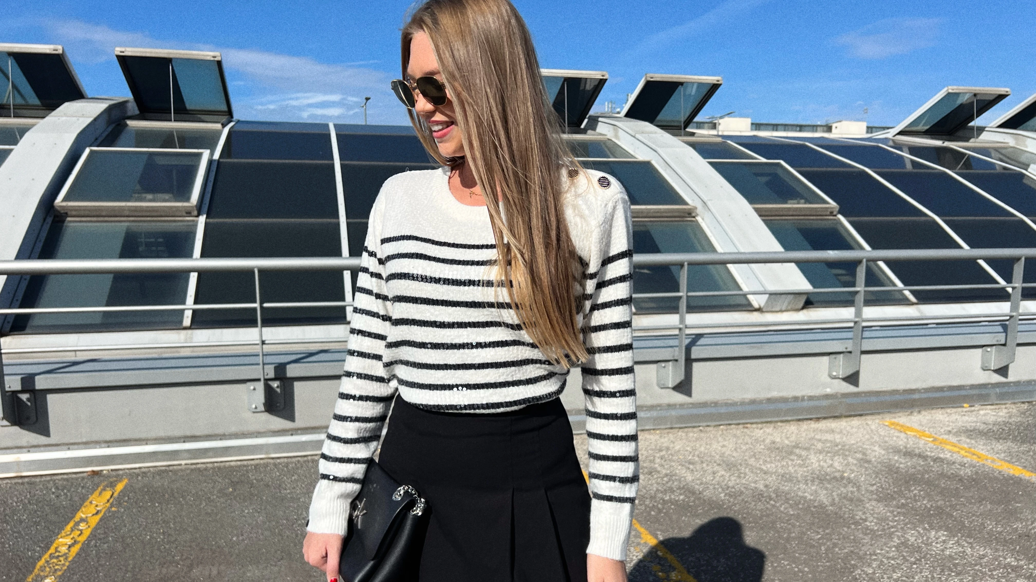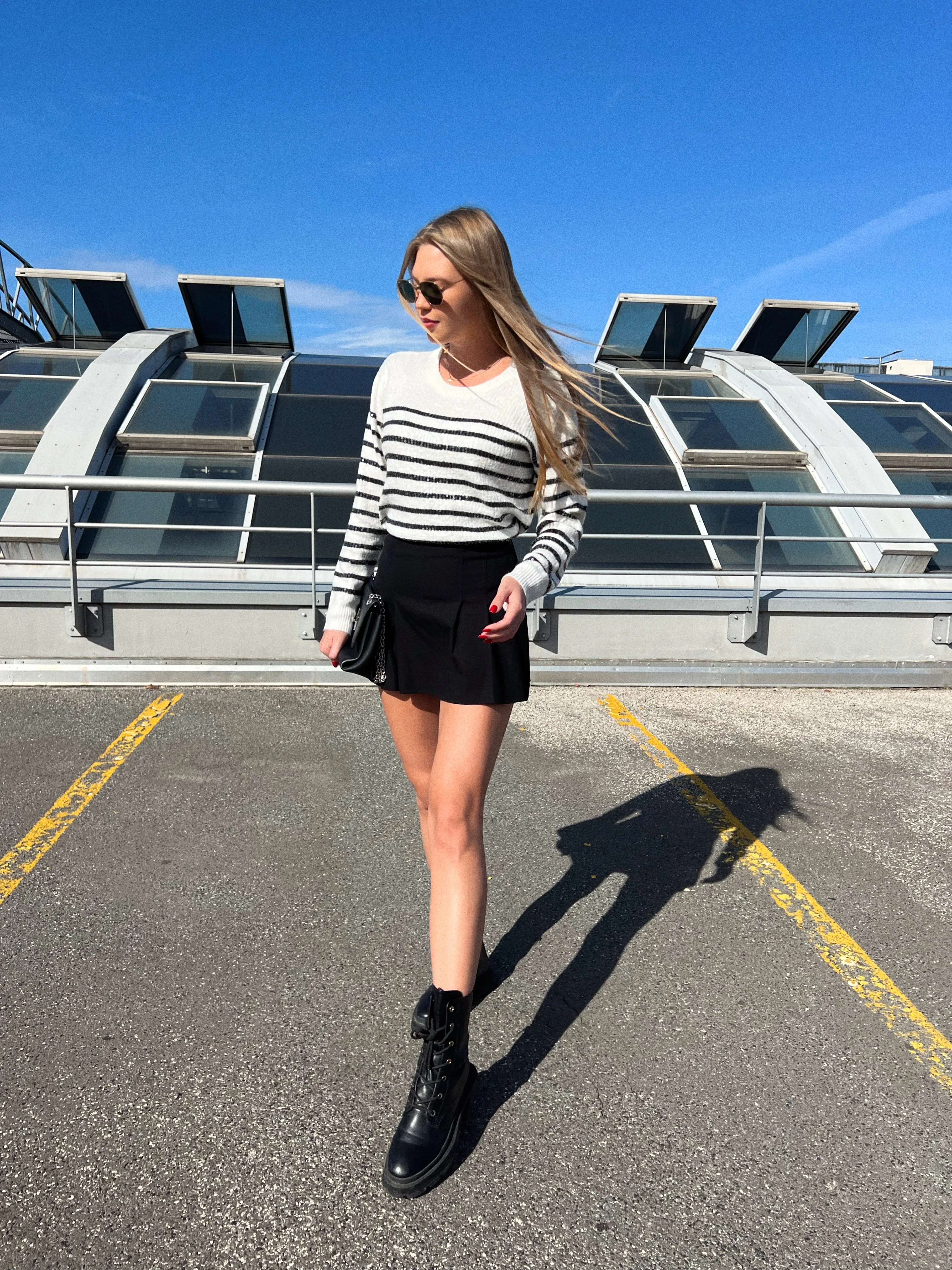 Szoknyát választottam egy csíkos pulcsival és bakanccsal. Most nagyon divat a csíkos minta, így az egyszerű szettet feldobtam egy mintás felsővel.