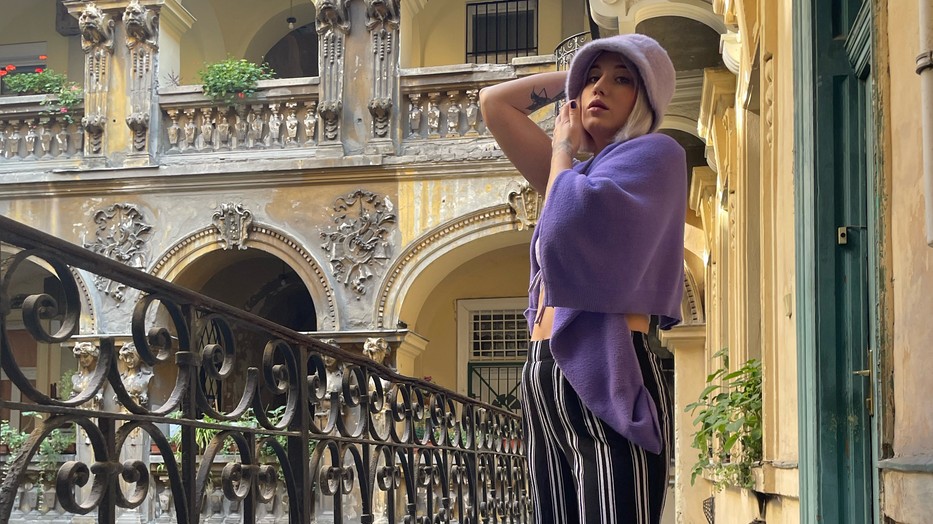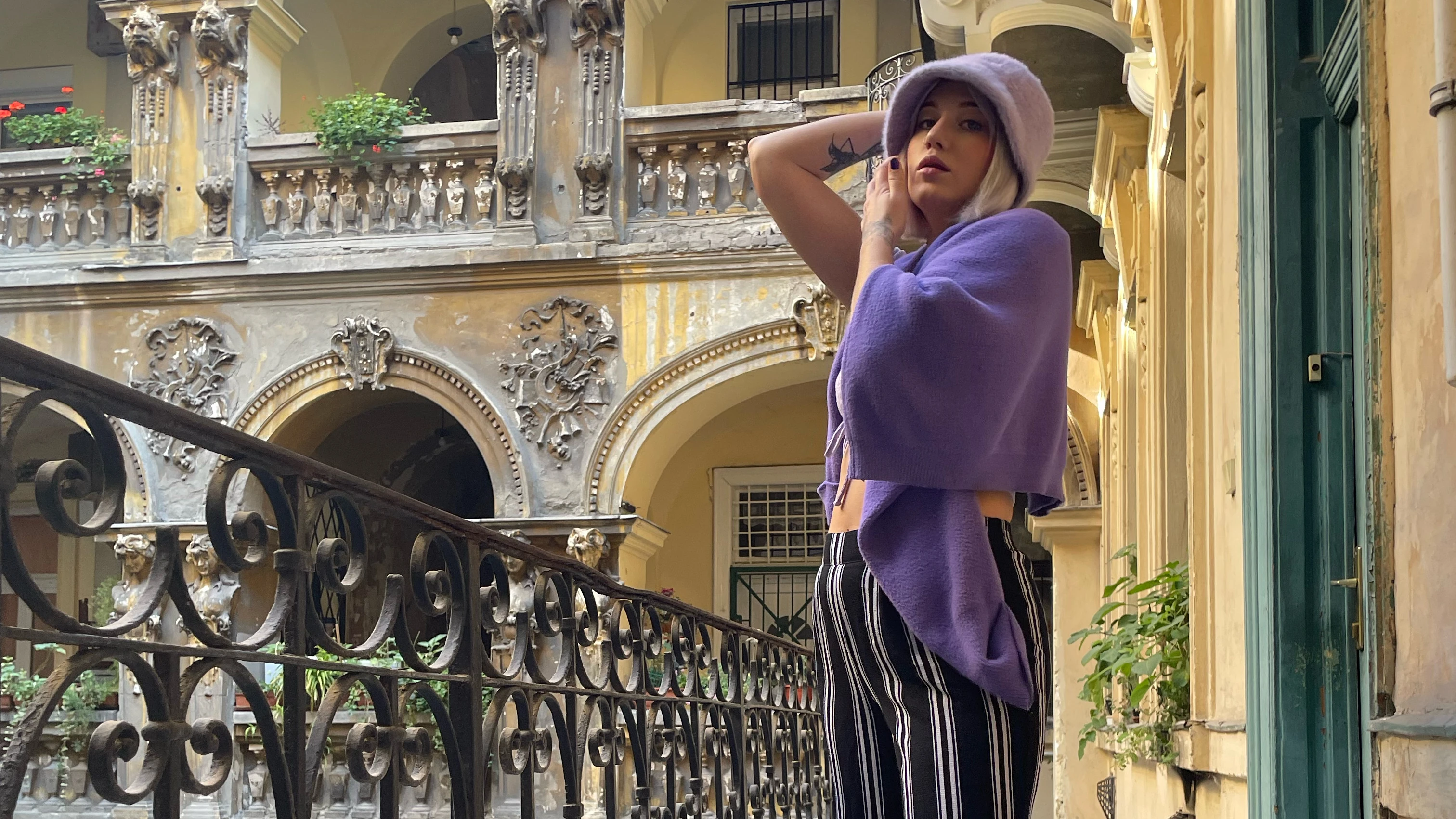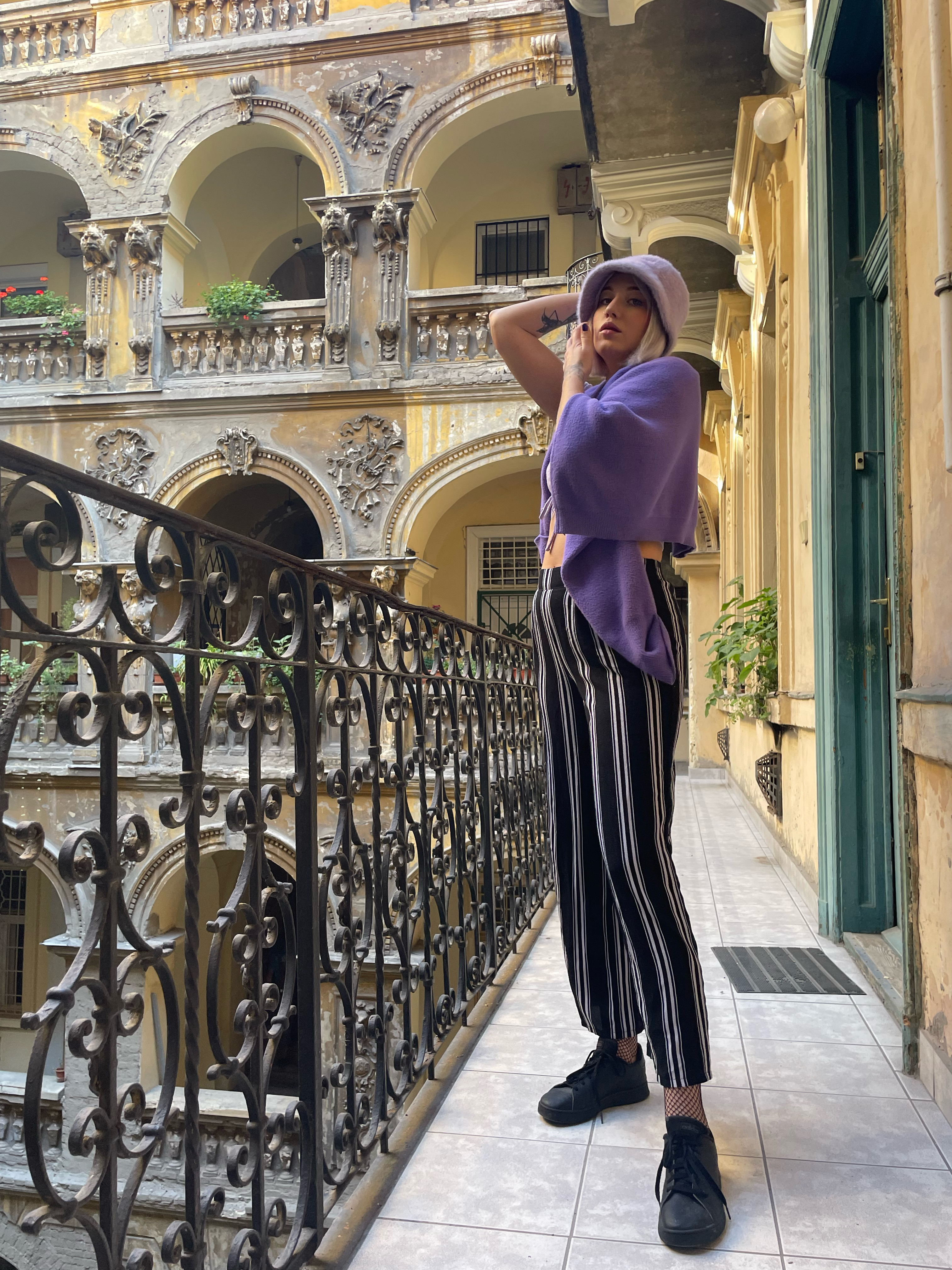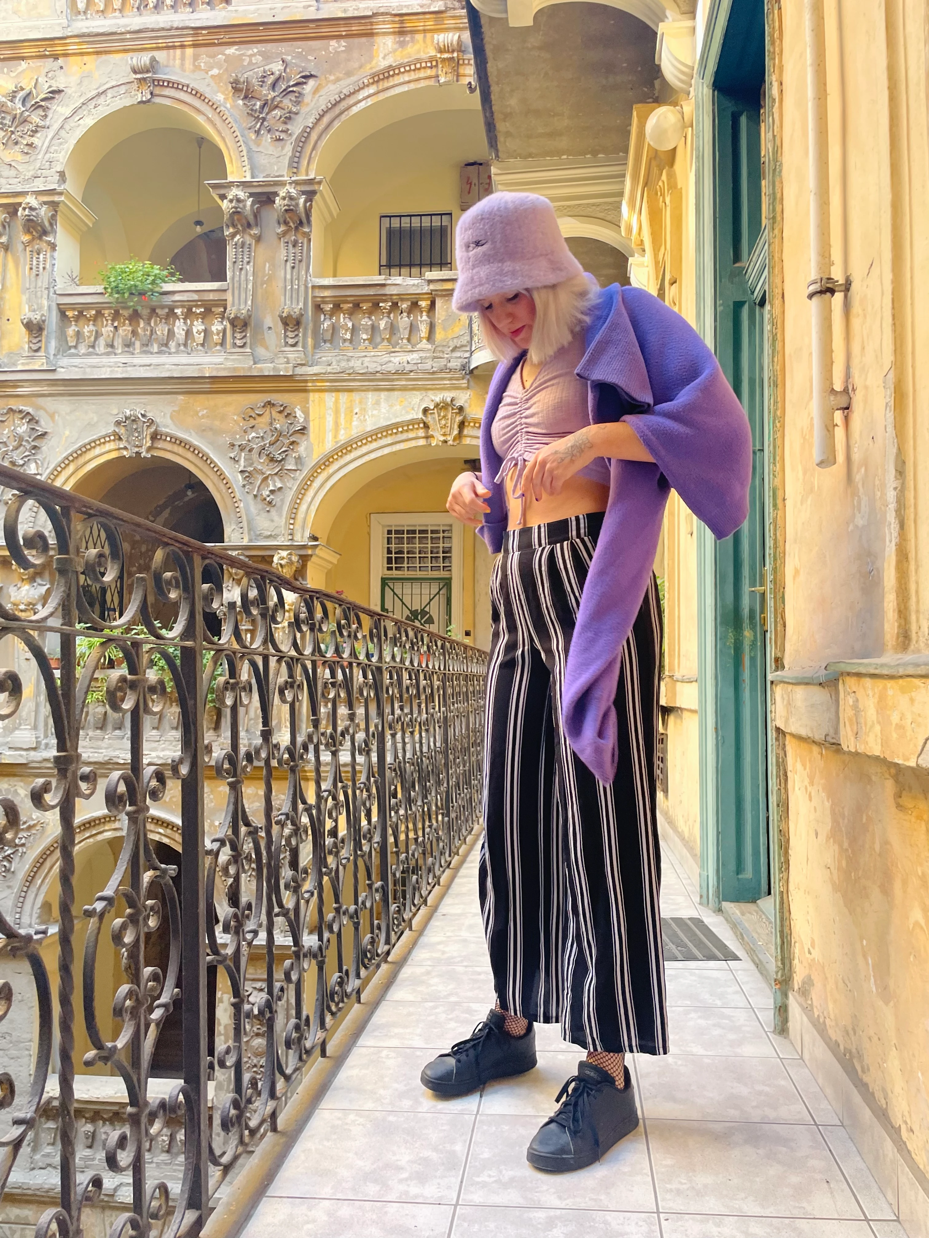 Tök jó idő van ma, úgyhogy kimegyek a barátaimmal a Ligetbe liláskodni! Imádom a lilát, a Nem alszom ma nálad című dalom borítóján és klipjében is ezer árnyalata köszön vissza. Fekete necc, orgonaszín crop top, csíkos nadrág – meg egy meleg pulcsi, nehogy megfázzak. A szőrös sapi az egyik kedvenc kiegészítőm!