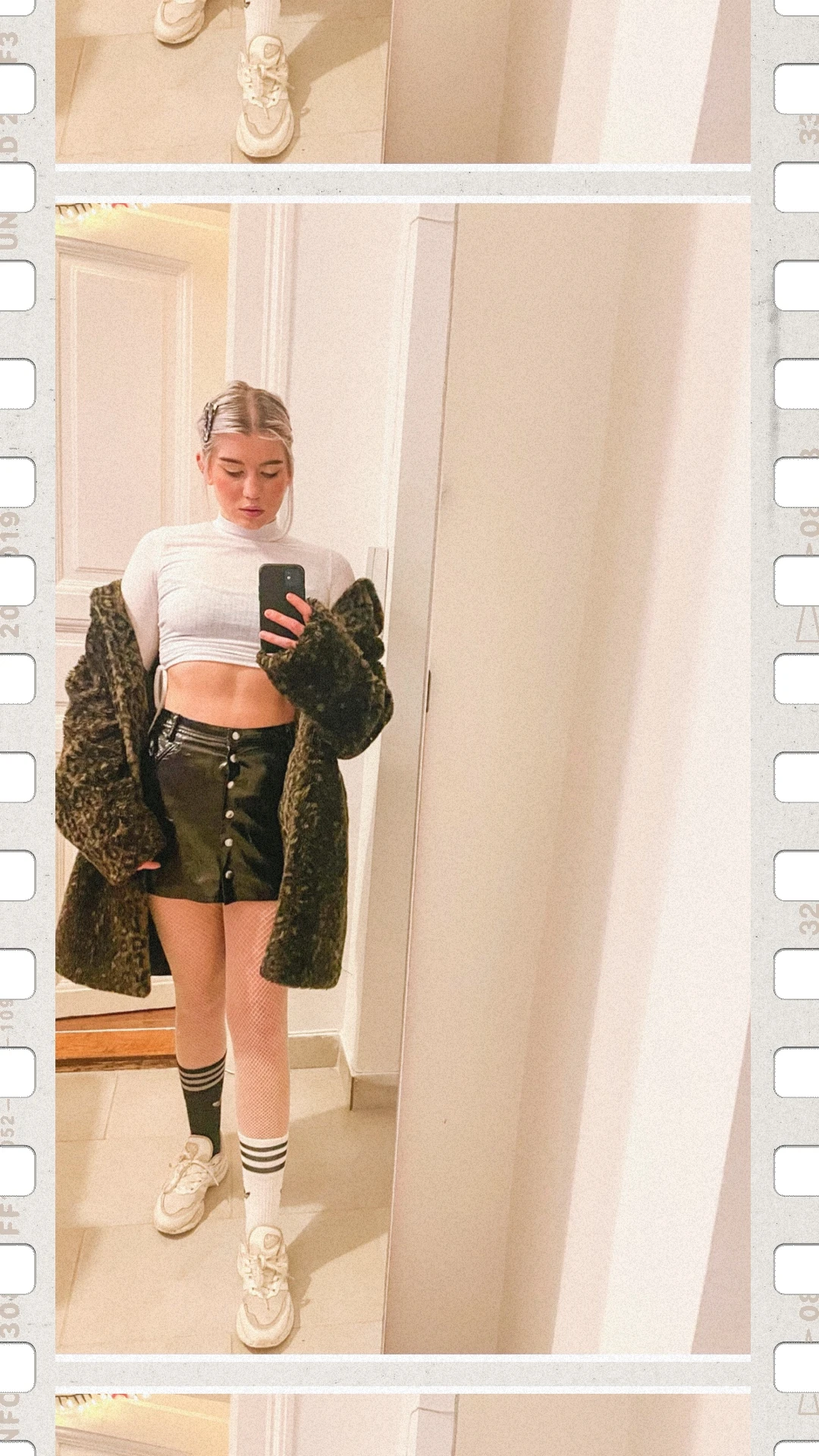 A mai szettembe is csempésztem egy kis játékosságot. Benézek egy barátnőm munkahelyére, egy specialty kávézóba, ehhez öltöztem – és persze egy klasszik tükörszelfit lőttem hozzá. Fekete-fehérhez van kedvem. Egy hosszú ujjú fehér crop garbót választottam, hozzá egy latex hatású fekete miniszoknya, fehér neccharisnya. Az egyik lábamra fekete, a másikra fehér zokni, fehér sportcipő, fekete-fehér márványmintás hajcsat, és egy leopárdmintás bunda.