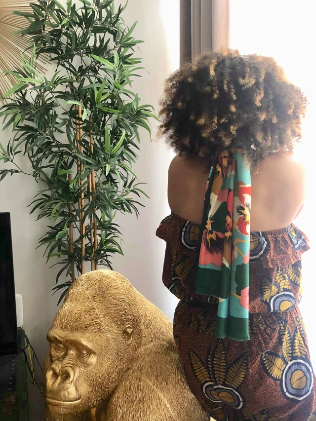 Nagyon szeretem az afrikai stílust, mely az otthonomban és az öltözködésemben is visszaköszön. A stílusomat a sokszínűség és az eklektika harmóniája jellemzi. Imádok az utazásaim során helyi autentikus darabokat vásárolni, amit bátran párosítok modern kiegészítőkkel, mint pl. ez a sál és fülbevaló.