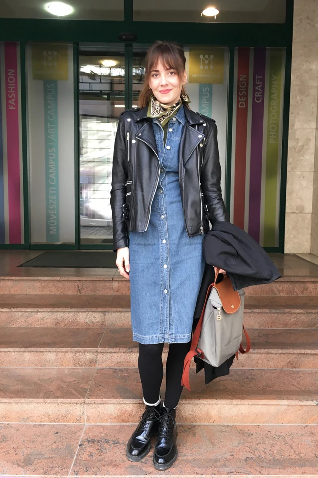 Nagyon izgatottan várom már a szemeszter kezdetét, hiszen idén több hallgatónak is diploma konzulense leszek, ami nagy felelősség és kihívás, de egyben számomra igazán kedves feladat. Óriási vintage rajongó vagyok, sokat járok turkálókba. A ruhatáram jelentős százalékát így válogatom össze. Ha külföldre utazom, sosem hagyom ki a helyi bolhapiacokat. Ma végre megéreztem az első tavaszias napot, de mivel eléggé fújt a szél, egy fekete ballonkabát mellett döntöttem, ami alá egy bőrdzsekit és egy farmerruhát vettem fel.
