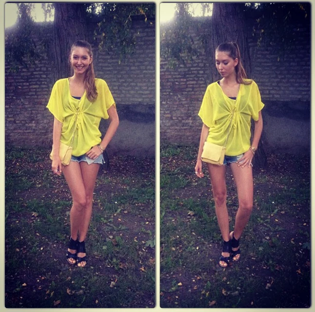 Nem vagyok egy nagy "magas sarkúzós" lány, de néha rám jön az őrület. Idén eléggé divatszín lett a sárga, szóval a farmershortot, ezzel a sárga felsővel párosítottam. Kiegészítőnek ezt a keresztbepántos táskát választottam.:))