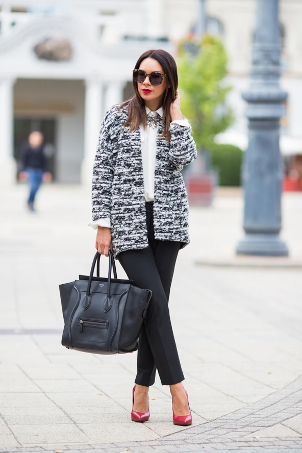 Mai napon egy klasszikus monokróm összeállítást választottam. Azért szeretem az fekete-fehér kombinációt, mert időtálló, bármilyen helyzetben megállja a helyét, ahogy mondani szokás "egyszerű, de nagyszerű". Napközben is gyakran használok vörös rúzst - főleg az ilyen borongós napokon, mint a mai - mert feldobja a szettet, csakúgy mint a hangulatomat. Szerettem volna ha valahol még visszaköszön a piros, ezért is választottam ezt a magassarkút, és maradtam a fekete táskánál, mert ugye a kevesebb néha több. ;) További szép napot Mindenkinek!