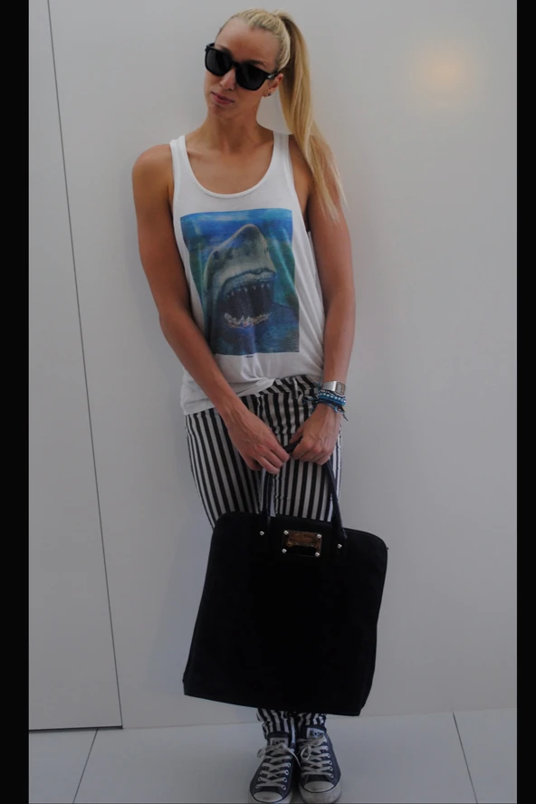 Ezen a nyáron ez a kedvenc pólóm, úgyhogy bármikor-bármivel szívesen viselem. Ráadásul, a cápa vízi élőlény, így elég közel érzem magamhoz :) A csíkos nadrágba néhány hónapja szerettem bele, hosszas keresgélés után találtam meg a tökéletes darabot, de sikerült! A farmerszínű Converse-em pedig igazi alapdarab a gardróbomban. Ebben a szettben egy barátnős-kávézásra indultam, mivel most jöttem haza a világbajnokságról, és rég nem láttam őket!