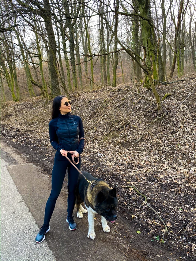 A két gyermekünk mellett nem szabad megfeledkeznünk a legidősebb családtagunkról sem. Hűséges kiskutyánk rengeteg törődést és mozgást igényel, így napi kétszer sétálni visszük a szomszédos erdőbe. Erős teste miatt alaposan átmozgat engem is a séták során, így mindig a legkényelmesebb edzős ruhámat választom hozzá.