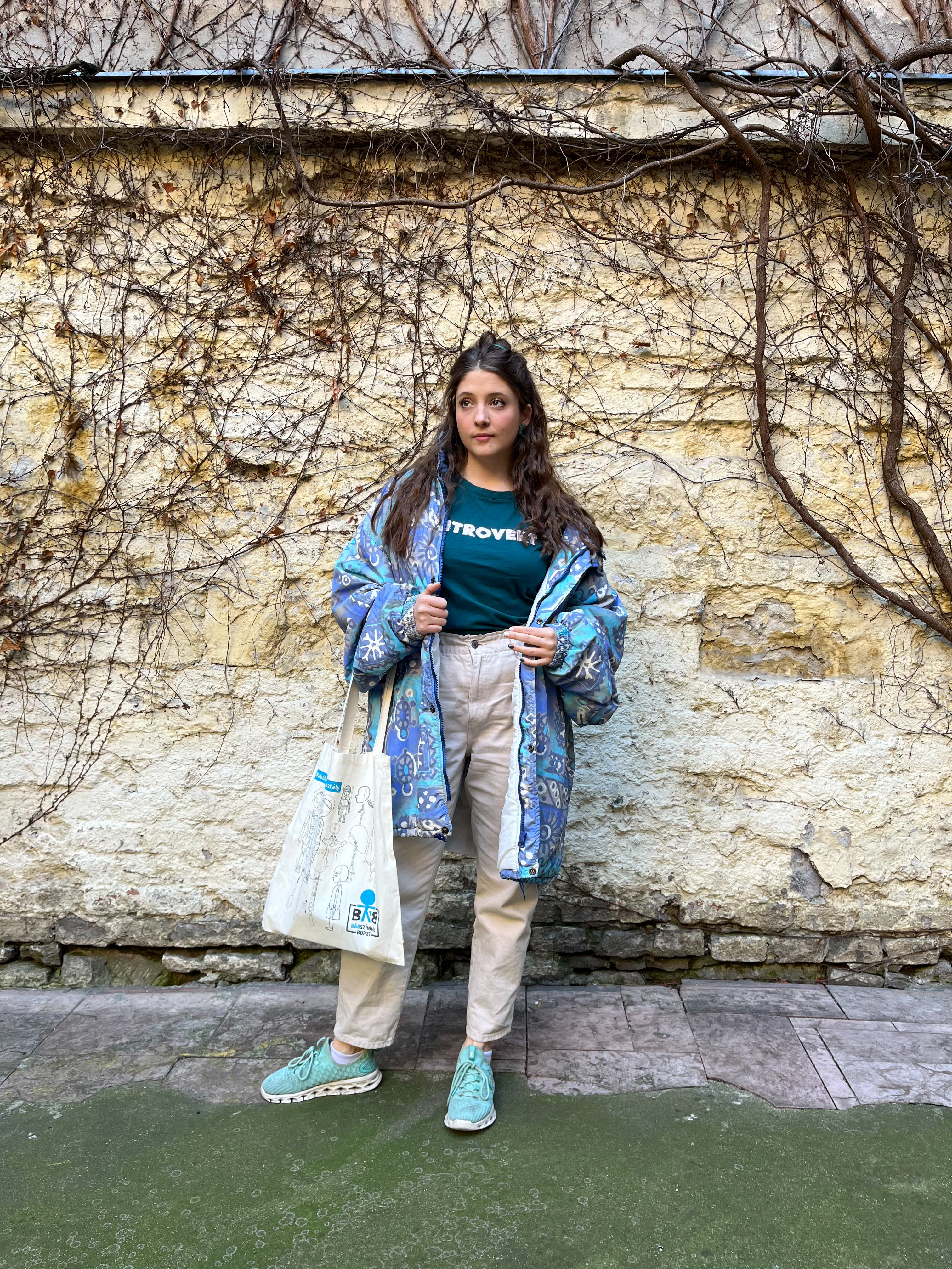 „Gyerekkorom óta imádom ezt a színvilágot, akkoriban valamilyen tengeri élőlény akartam lenni, de sajnos ez az álmom meghiúsult. Persze, tudom: soha nem szabad feladni. Az introvert feliratú póló az egyik kedvencem, Mimi barátnőmtől kaptam, miután elhatároztam, hogy ezentúl introvertált leszek. Még dolgozom az ügyön.”