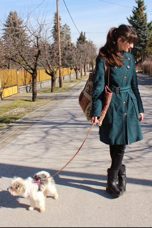 Egy kis hétvégi séta a kutyusommal. Az egyik kedvenc kabátomban, a vállamon pedig a legpraktikusabb, óriási szövött táskámmal.