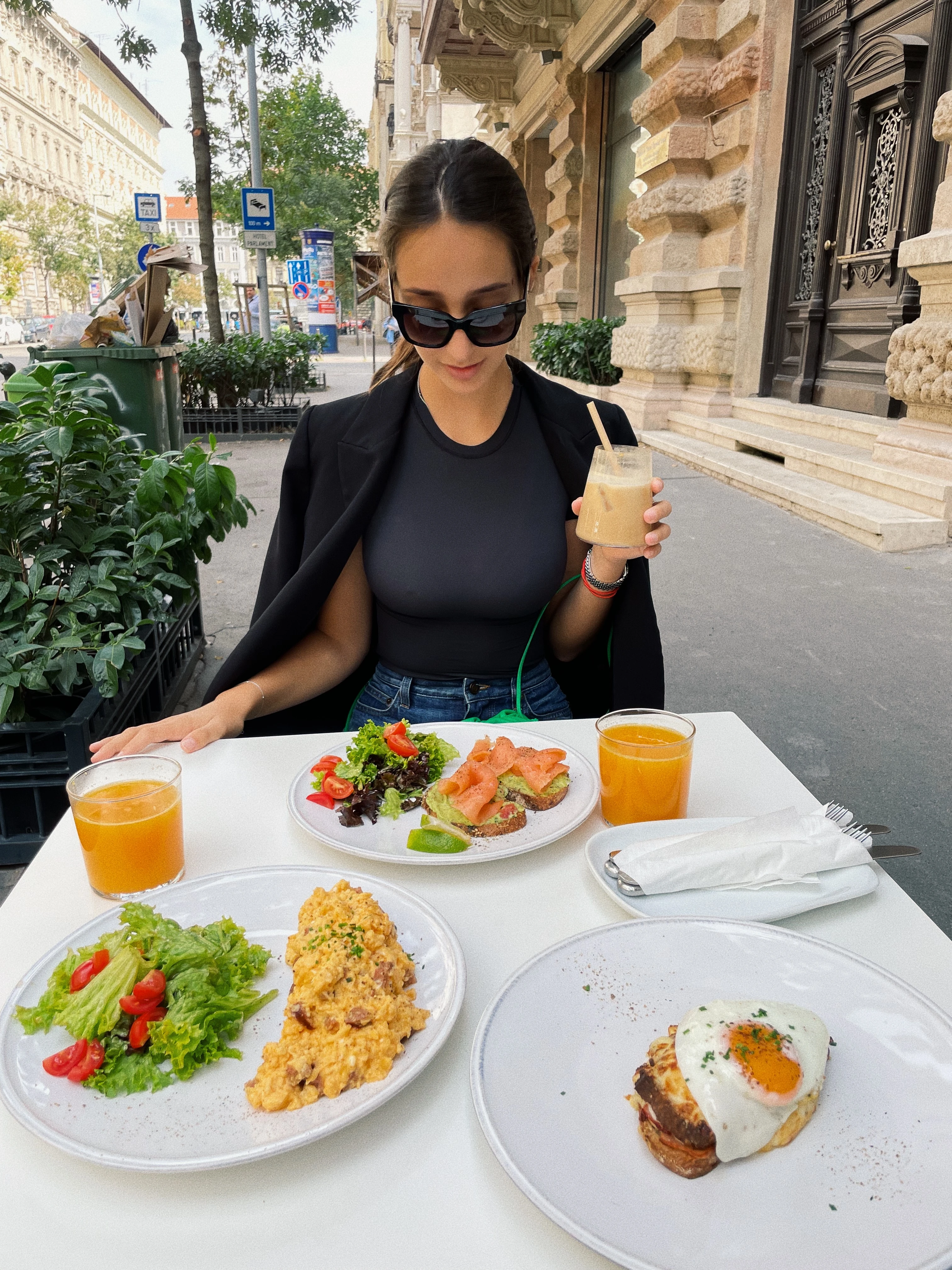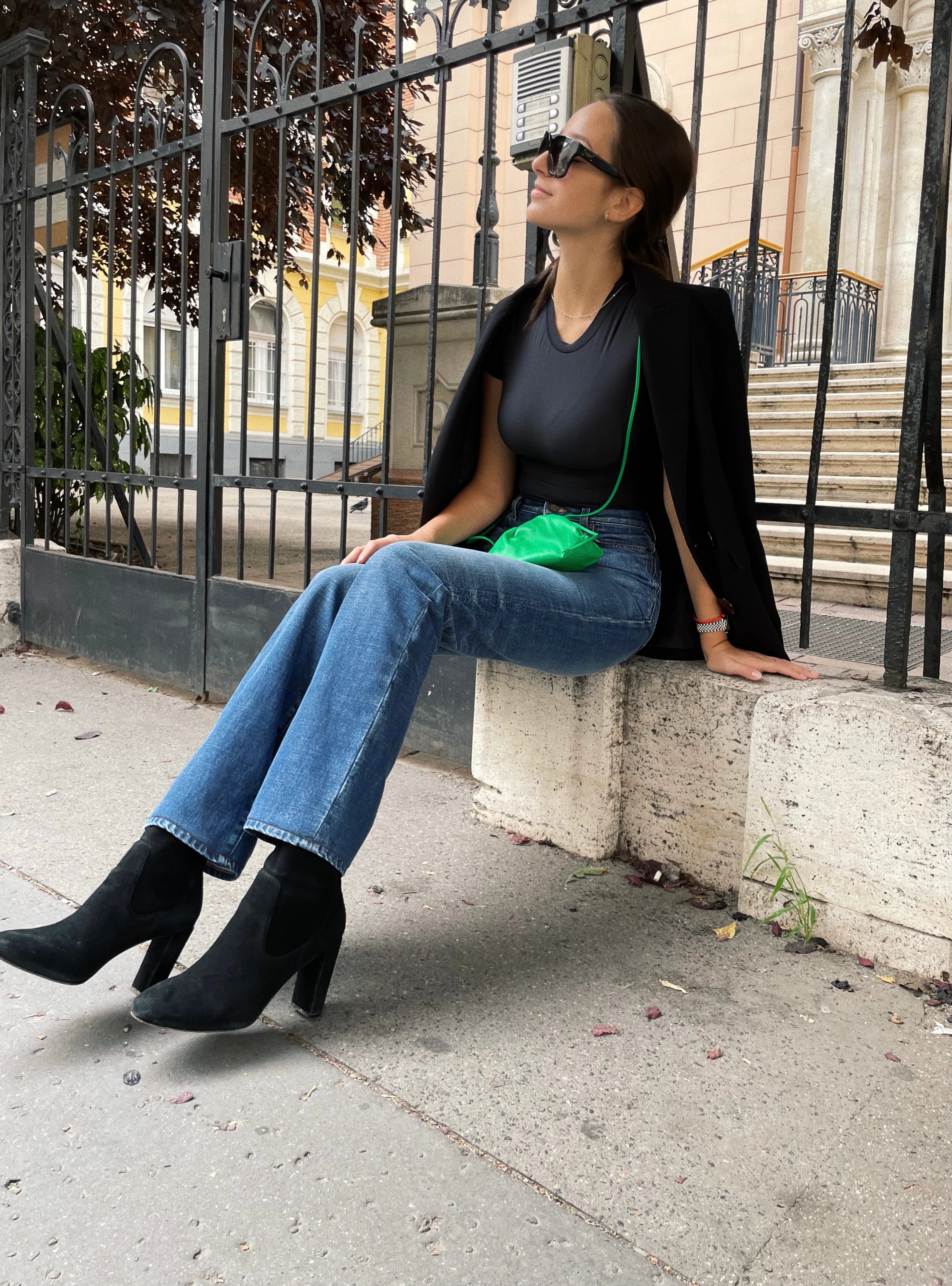 A mai napon el látogattam a Six Letter nevezetű kávézóba ahol kedvenc kávémmal élveztem a reggelemet. Régóta járok ebbe a kávézóba és szinte mindig ugyan azt kérem, ami nem más mint a dirty chai latte. Elég hűvös volt én pedig nagyon fázós vagyok tehát ennek megfelelően választottam ki a mai szettem. Nadrágnak ezt a 90-es évek által inspirált farmert választottam, hozzá egy egyszerű fekete pólót illetve zakót vettem fel. Mivel végül a cipőm is fekete színű lett tudtam, hogy muszáj valamivel feldobni így tehát bele vittem egy kis Bottega zöldet !