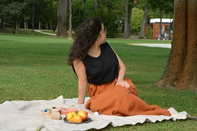Imádunk piknikezni. Amikor csak tehetjük, pokrócot ragadunk és kimegyünk a természetbe. Egy ilyen családi programhoz kizárólag kényelmes szett illik, ami nem is lehetne más, mint a kedvenc anyagomból készült nyári ruha. Igazi megszállottja vagyok a dupla géznek. Életünk minden területén használjuk ezt a könnyed, organikus anyagot, az ágyneműtől kezdve, a konyhai textíliáikon át, sálnak is. Tökéletes választás egy ilyen szabadtéri programhoz és minden máshoz is.