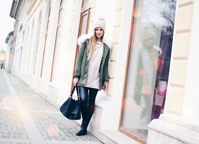 A hetet egy laza és meleg szettel indítom, hiszen sok elintéznivalóm van a városban. Télen is imádom a pasztell színeket viszontlátni az outfitjeimben, így hát a világos rózsaszín ma sem hiányozhat az öltözékemből. Rohangálós napom fő eleme egy jó meleg sapka, s máris kényelmesebben tudom intézni a dolgaimat. (sapkán kívül minden saját nagykárolyi üzletünkből van, melynek Bady Hully a neve, sapka Bershka)