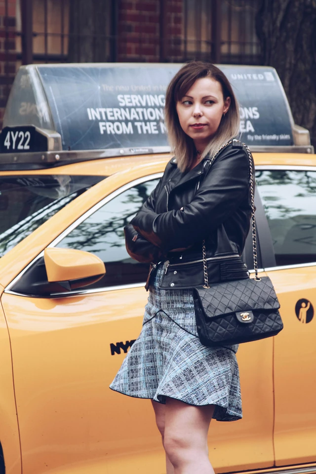 Ma van a szülinapi vacsorám a családdal és közeli barátokkal. Vacsora után elmegyünk egy másik helyre koktélozni, így ezt a ruha és bőrdzseki-kombót választottam a New York-i bulizáshoz.