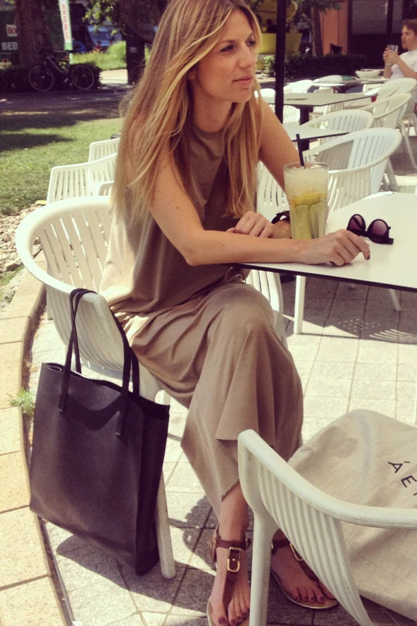Eszter egy maxi homokszínű ruhát visel a 2014-es tavasz-nyári ÁERON kollekcióból, hozzá pedig fekete bőr ÁERON shopper táskát.