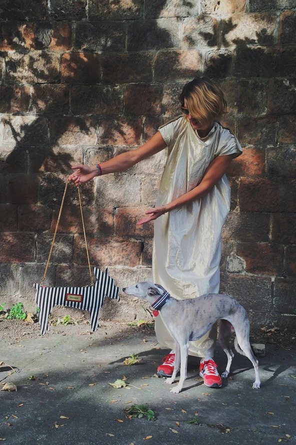 A hé utolsó munkanapját korán kezdtük egy anyagbeszerző körúttal, és mivel nem lesz időm átöltözni a délutáni programig, így egy elegáns, de azért kényelmes ruhát választottam (én csak királylányruhának hívom). Utána meg egy kis műhelymunka és aztán irány Szentendre és a kiállítás megnyitó. Természetesen kutyával! :)