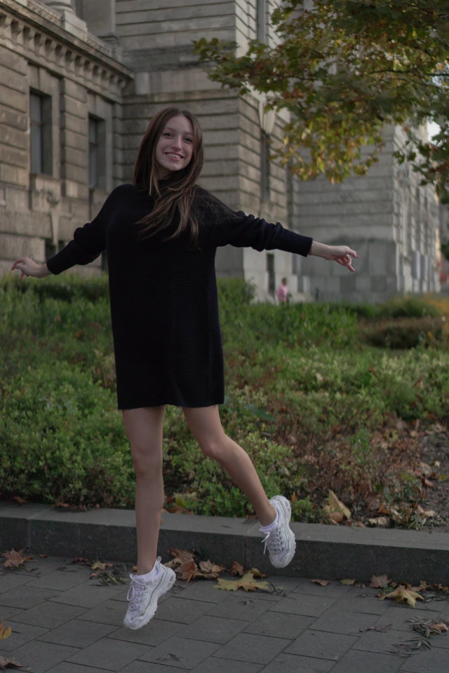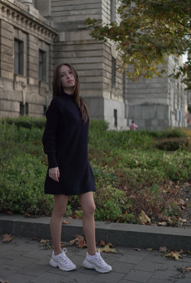 A mai a leglazább outfittem, tökéletes akár suliba, akár egy sétára a városban. A sötétkék kötött pulcsim ruhaként is tökéletesen megállja a helyét, így egy egyszerű harisnyával és egy fehér edzőcipővel. Ez a legkényelmesebb szettem egész héten! Köszönöm, hogy velem voltatok, remélem tetszettek az összeállításaim!