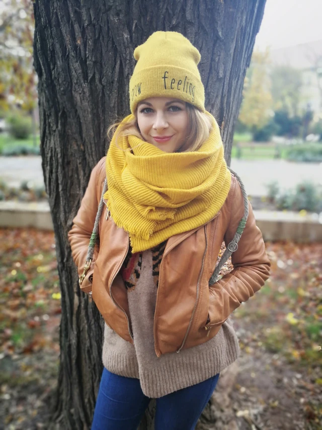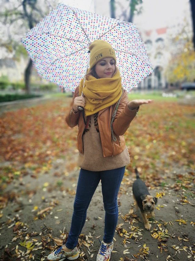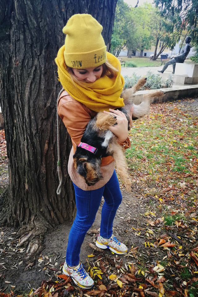 Enikő vidám sárga szettben sétáltatja ma kutyusát