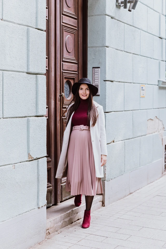 A ruhatáram egyik alapdarabja a plisszé szoknya. Ez az a darab, ami tökéletesen megállja a helyét minden szezonban és kismamaként a kerekedő pocakomat is finoman megmutatja. A hűvösebb őszi napokon gyapjú kabátokat viselek, mivel fázós típus vagyok a mai letisztult szettem egy kalappal dobtam fel. A szerdai napokon általában az ügyfeleimmel találkozom és a személyre szabott darabokat próbáljuk le.