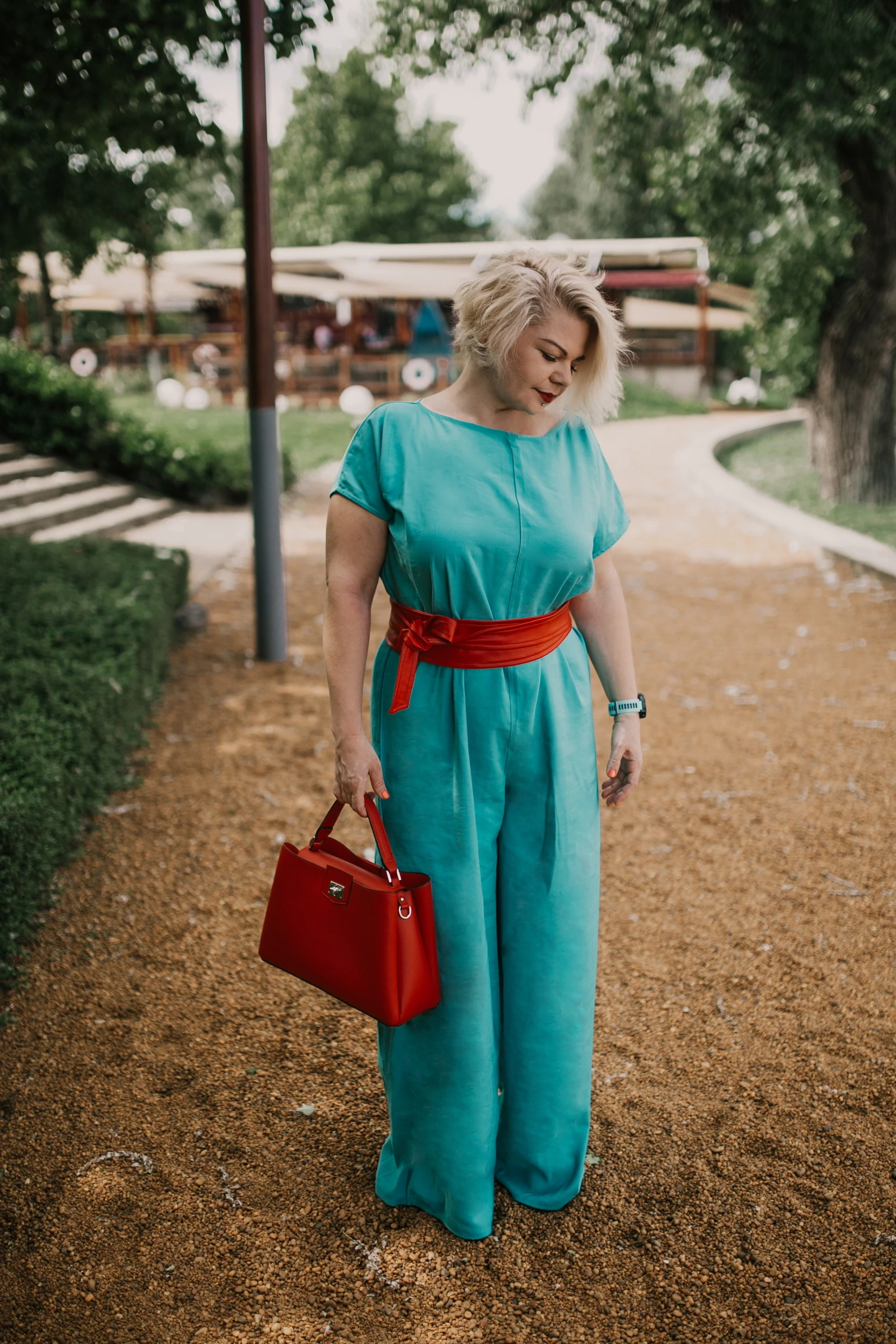 Ma így indultam neki a napnak, ha esik, csak magamra rántok egy bőrkabátot, ha nem, akkor pedig az overál szuperül néz ki a piros övemmel.
