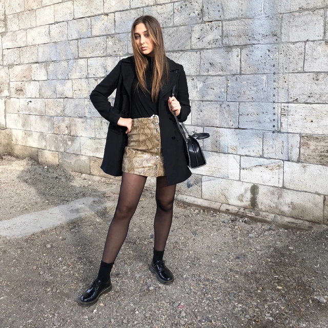 Szeretem, amikor egy szetten belül van egy hangsúlyos ruhadarab, jelen esetben a kígyómintás műbőr miniszoknya, és a többi kiemeli ezt, ezért csak fekete színt vettem hozzá. Az egész öltözet stílusát is ez a szoknya adja meg, egy kicsit a hatvanas évek divatját idézi, jó persze a széles kihajtós, kétsoros, szűkített kabát és a garbó is rásegít erre. Az egész kinézetben van még valami brit beütés is, a Beatles és a Rolling Stones világából, ezért választottam ezt a cipőt és a táskát hozzá. Ma úgyis a városban rohangálós, ügyintézős napom lesz és a kiadómhoz is be kell ugranom.