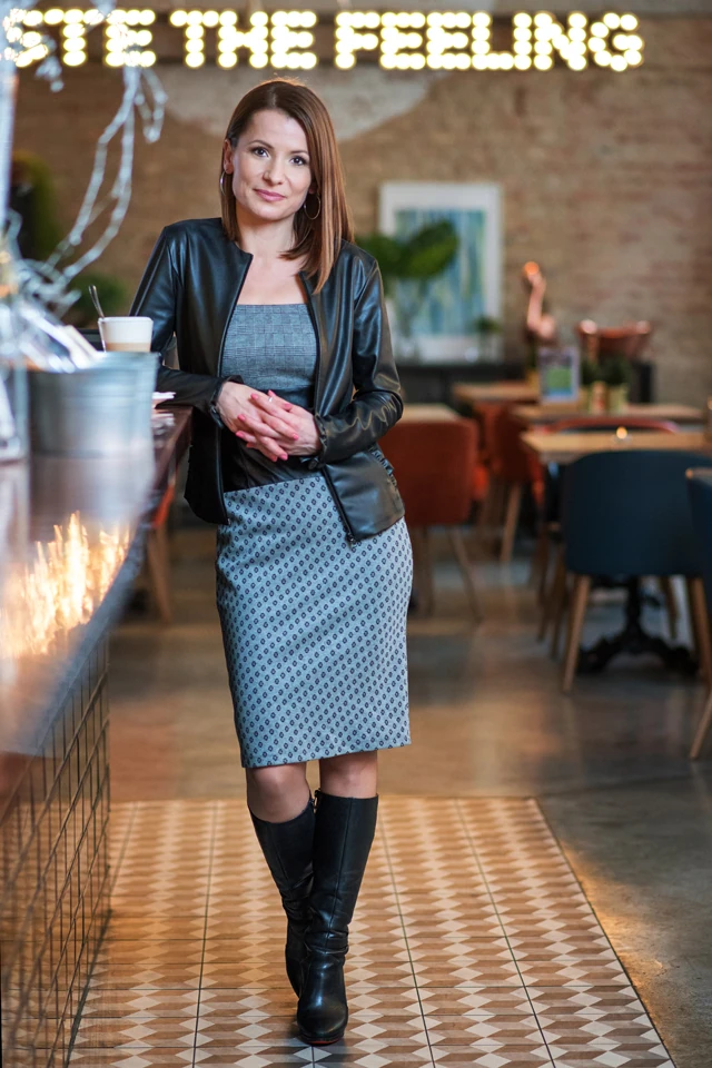 Emiatt különösen megtalálta önmagát Dankó Ágnes divattervező ruháiban. A hét első napján is egy ilyen összeállításra esett a választása: kényelmes, de elegáns ruha egy szolidan díszített blézerrel. Tökéletes lesz a hétfői megbeszélésekhez. Az egyik kedvenc helyére, a Nanába egy gyors kávéra betérve örökítette meg nekünk mai szettjét.