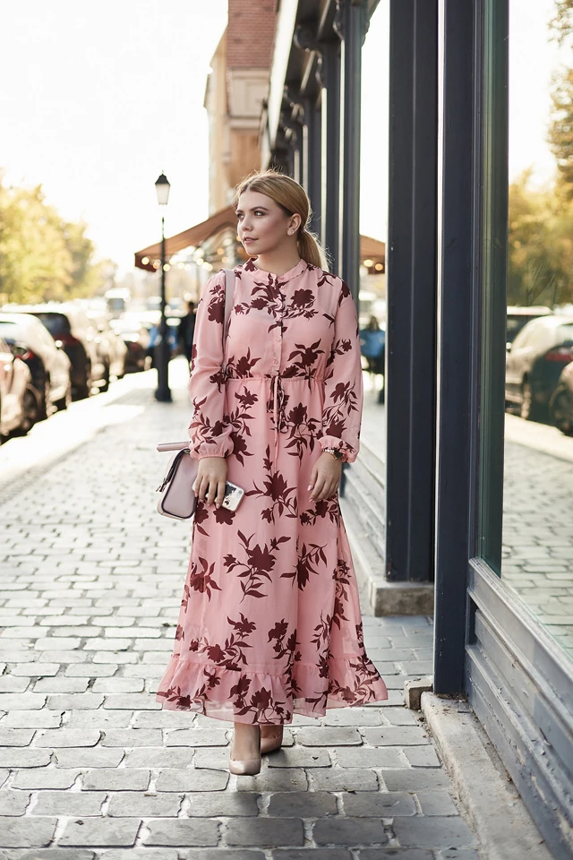 A munkámból adódóan ma egész délelőtt találkozóim voltak az ügyfeleimmel, így nem az irodában kezdtem a napot, délután viszont rohantam vissza. Munka után a Király utcában lesz egy megbeszélésem, mert több lábon állva, más közösségi oldalakat is kezelek. Ezt követően pedig az estémet egy csodálatos, magyar tervezőnő új üzletmegnyitójának eseményén fejezem be. Ennek megfelelően állítottam össze a mai szettem. Egy hosszú ruhával sosem lehet mellélőni, a színei pedig megfelelően ellensúlyozzák a visszafogott szabásvonalát. Ezt a ruhát tökéletesnek találtam a meetingekre és az esti megnyitóra is. Ma szerencsére az eső sem esett és autóval tudtam közlekedni, így a cipő esetében körömcipőre esett a választásom.