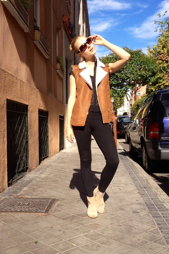 Ma már a napfényes Madridból üdvözlök mindenkit! Az első napomon egy nemzetközi magazinnál és Hearst Espananál jartam (hozzájuk tartozik egy nemzetközi divatmagazin és a Fotogramas is) . Ehhez a naphoz egy fekete Zara leggingst, egy áttetsző Bershka blúzt és egy Bershka bőrmellényt választottam egy Guess napszemüveggel. Sminket ilyenkor nem viselek, hiszen az ügyfelek a természetes megjelenést preferálják itt Európában.