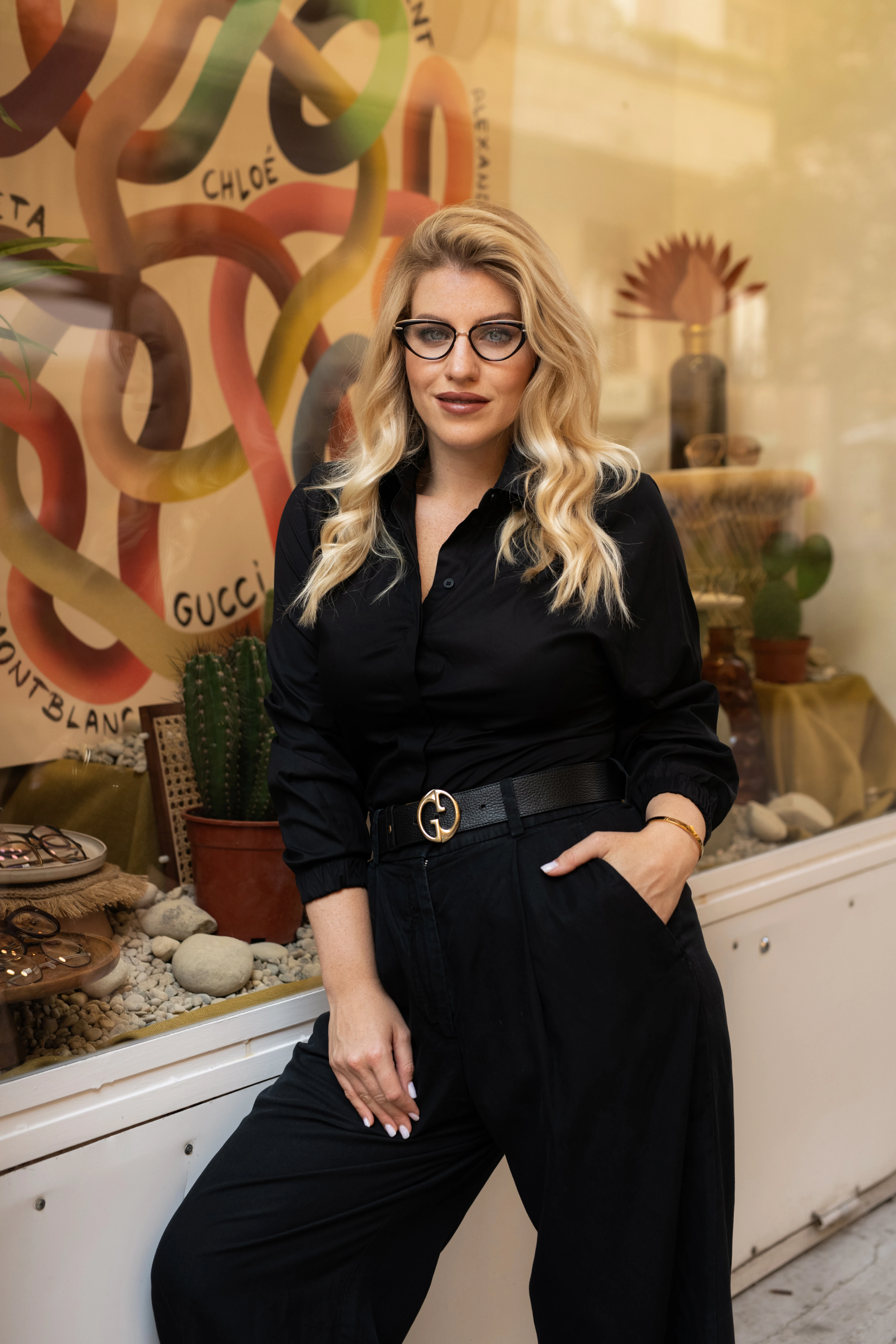 „A hetem nagy részét az üzletemben töltöm. Nagyon szeretek itt lenni és törekszem rá, hogy mindig elegánsan, letisztultan öltözzek. A kényelem is fontos szempont, hiszen állandóan mozgásban vagyok. Egyfajta multifunkcionális szettet kell minden napra összeállítanom, hiszen van, hogy kirakatot kell rendeznem vagy terméket fotóznom, miközben bármikor bejöhet egy vendég. Főként a COS darabjait választom ezekre a napokra. Ez a kedvenc nadrágom, amit különböző felsőkkel kombinálva mindig más hatást tudok elérni. Természetesen egy optikai keret nem hiányozhat az összeállításomból, így az egyik kedvenc szemüvegemet választottam ma."