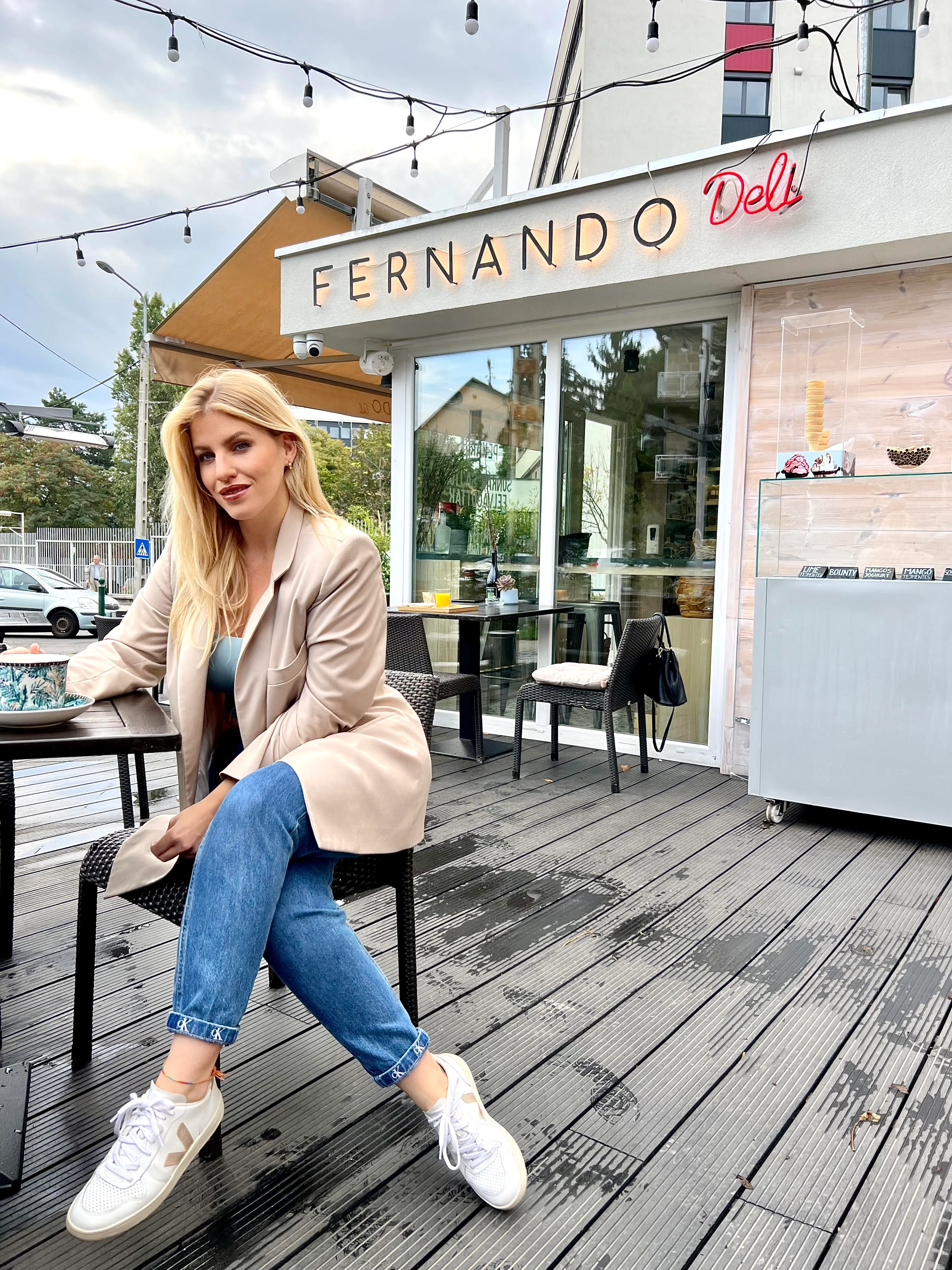 „Miután bevittem a kisfiam az óvodába, egy közeli delikáteszben kezdem a hetem. A lassú hétvége után komótosan kapcsolódom vissza a hétköznapok forgatagába. Figyelem a körforgalomban kavargó autókat, miközben egy finom kávét iszogatok a e-mailjeim társaságában, fokozatosan hangolódva rá az elkövetkezendő napok pörgésére. A hétfőt a kedvenc nude blézeremben kezdem, számomra egy nagyon kedves tervező, Celeni készítette. Rajongok ezekért a ruhadarabokért, nagyon jól tudom idomítani minden élethelyzetben. Most egy pasztell színű Triumph toppal és egy farmerrel párosítottam. Hozzá egy fenntartható cipőmárkát választottam. Teljes gyűjteményem van blézerekből, és a ruhatáram kihagyhatatlan részét képezik."