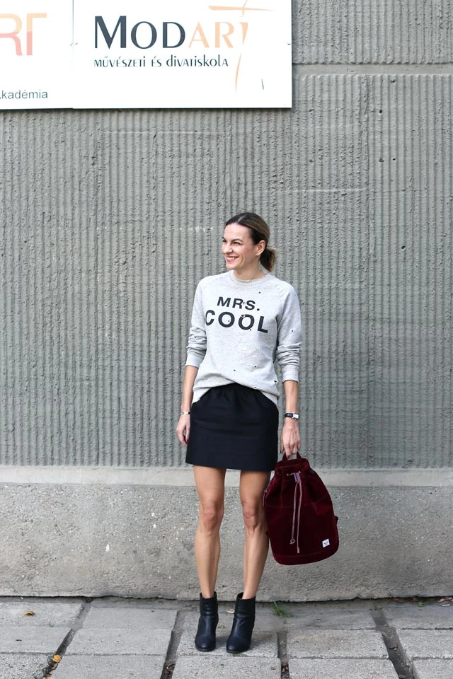 A hétfőt a Mod`Artban kezdem, ahol hetente háromszor tartok órát leendő divattervezőknek és divatmenedzsereknek. Régóta tanítok, de még mindig nagyon élvezem, hogy egyszerre nagy felelősség, de közben rengeteg lehetőségem is van, hogy inspiráljam a hallgatóimat és mindig nagyon örülök a későbbi sikereiknek. Mivel az egész suli a divatról szól, szerencsére nincs szigorú dress code a tanároknak sem, így a kedvenc feliratos pulcsim pont tökéletes egy ilyen hűvös napra.