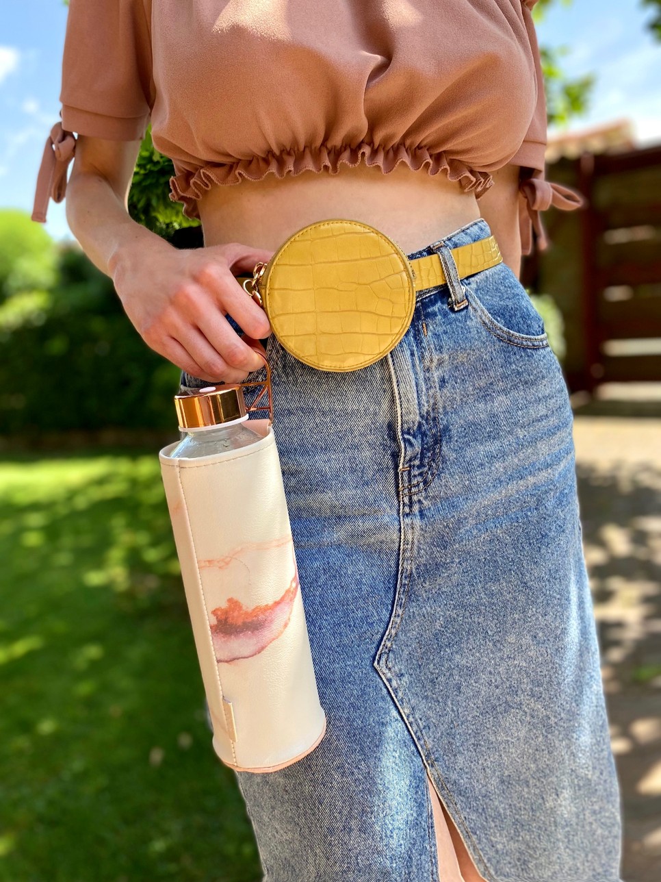 Nem, ez nem az a táska, amiben elfér egy nő fél élete. Ez egy öv, amiben elfér egy zsepi és a kulcsom. A legfontosabb amúgy is a kezemben van, a kulacsom, ami mindig, mindenhova velem jön.