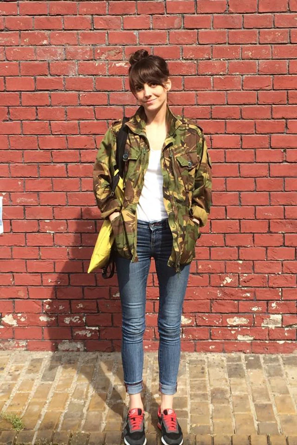 Ma 9-től volt az első meetingem, ezért kabátban indultam el reggel. Ez most a kedvenc darabom, egy vintage boltban csaptam le rá. Szeretem a terepmintát, és ráadásul ez eredetileg férfi darab. Rendszeresn vásárolok a férfiosztályokon a high street márkáknál, mert néha sokkal jobb dolgokra bukkanni, mint a női részlegen, és hozzam amúgy is közel áll a tomboy stílus. A cipőm egy nagyon kényelmes Nike, majdnem minden nap ezt hordom, mivel nemrég volt egy balestem és ez a legkényelmesebb. A táska pedig multifunkciós, shopperként vállon lehetet hordani, de hátizsákként is működik.