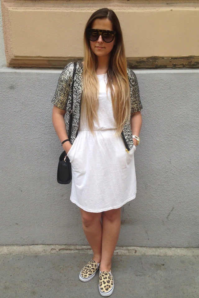 A hőségriadót és a business casual dress code-ot, amit a munkahelyem előír, nehéz összeegyeztetni, főleg úgy, hogy közben szeretnék stílusos is maradni. Ebből az elgondolásból született ez a szett, ahol a kis pamutruhát megspékeltem egy aranycipzáros rövid ujjúval és hozzá szerintem nagyon jól passzoló cipővel.
