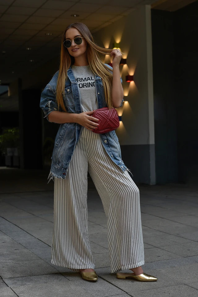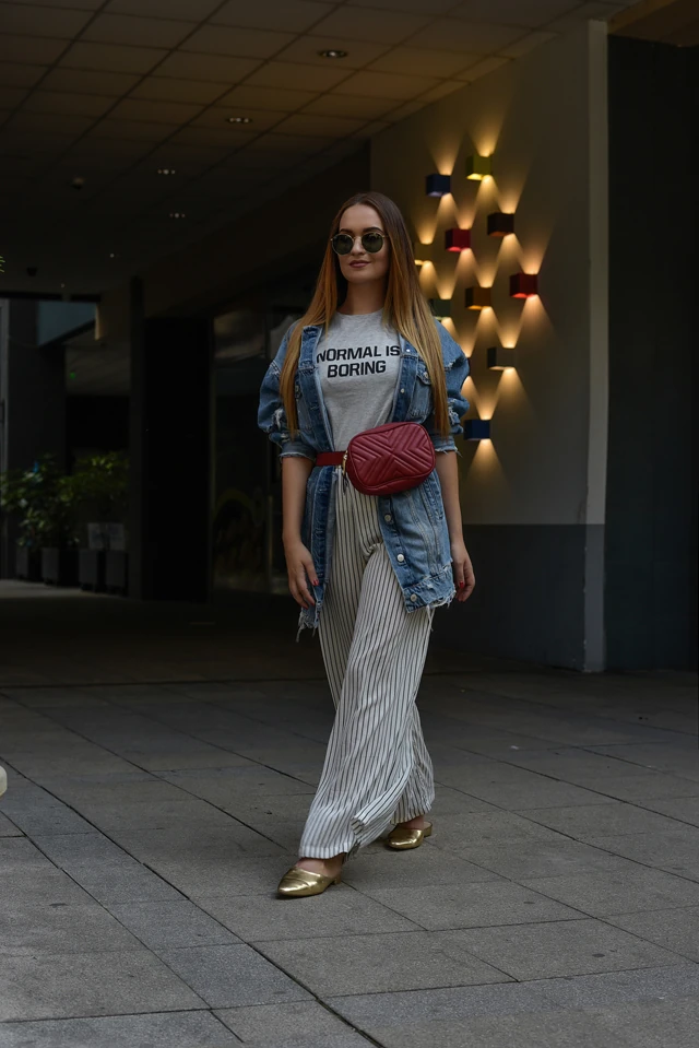 A farmerkabát egy örök klasszikus darab, amiből a rövid és hosszú fazont egyaránt szeretem. Nagyon örülök, hogy újra trendi az övtáska, amit én ma inkább övnek, mint táskának használtam. Az egyszerűbb feliratos pólómat pedig egy laza csíkos nadrággal dobtam fel. Imádok játszani a különböző színekkel, mintákkal és stílusokkal egy szettben!